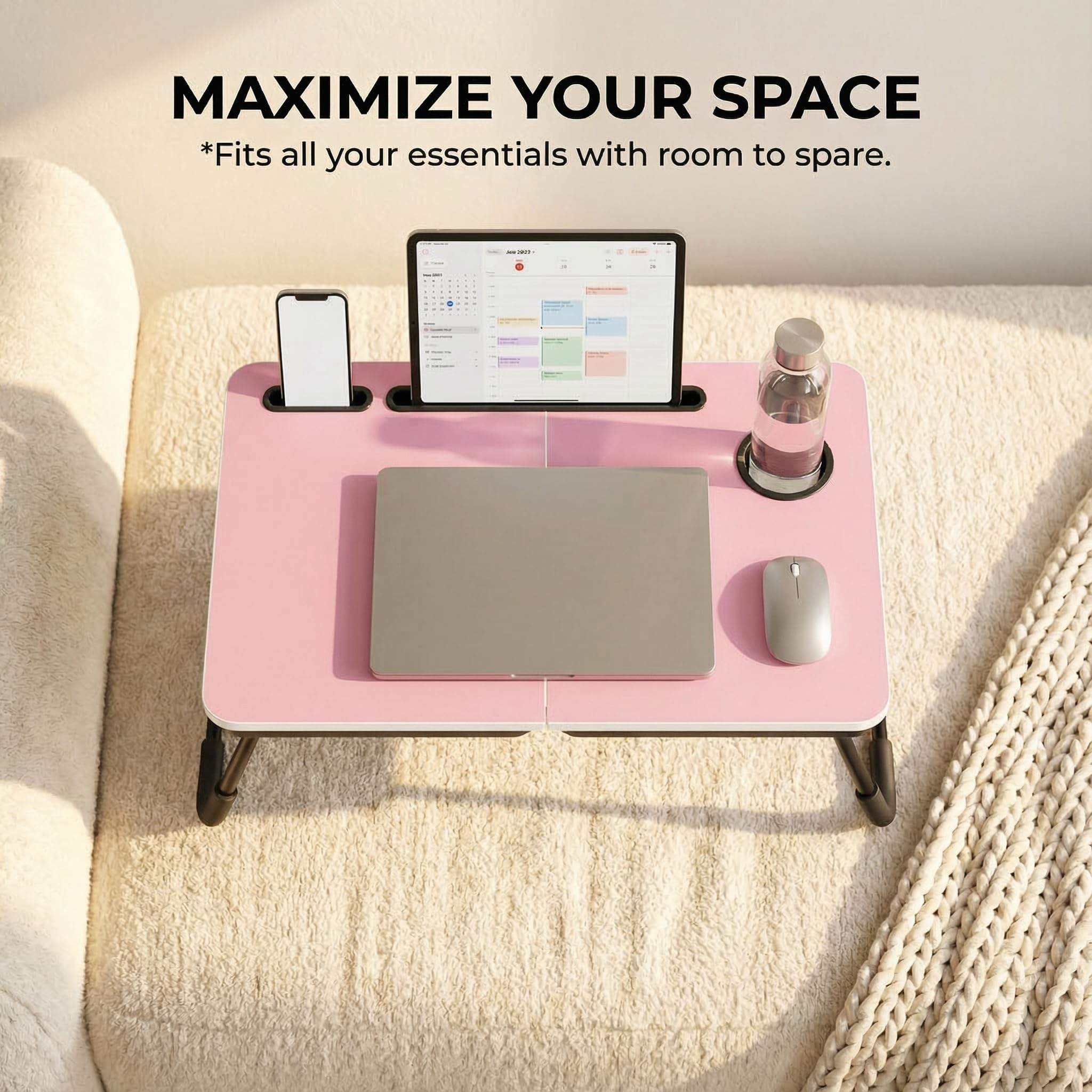 GENEROUS TABLETOP DIMENSIONS: The extra-wide surface easily holds 17" laptops with room to spare for a mouse and snacks. The ergonomic curved front ensures body comfort while sitting cross-legged on the floor or sofa.