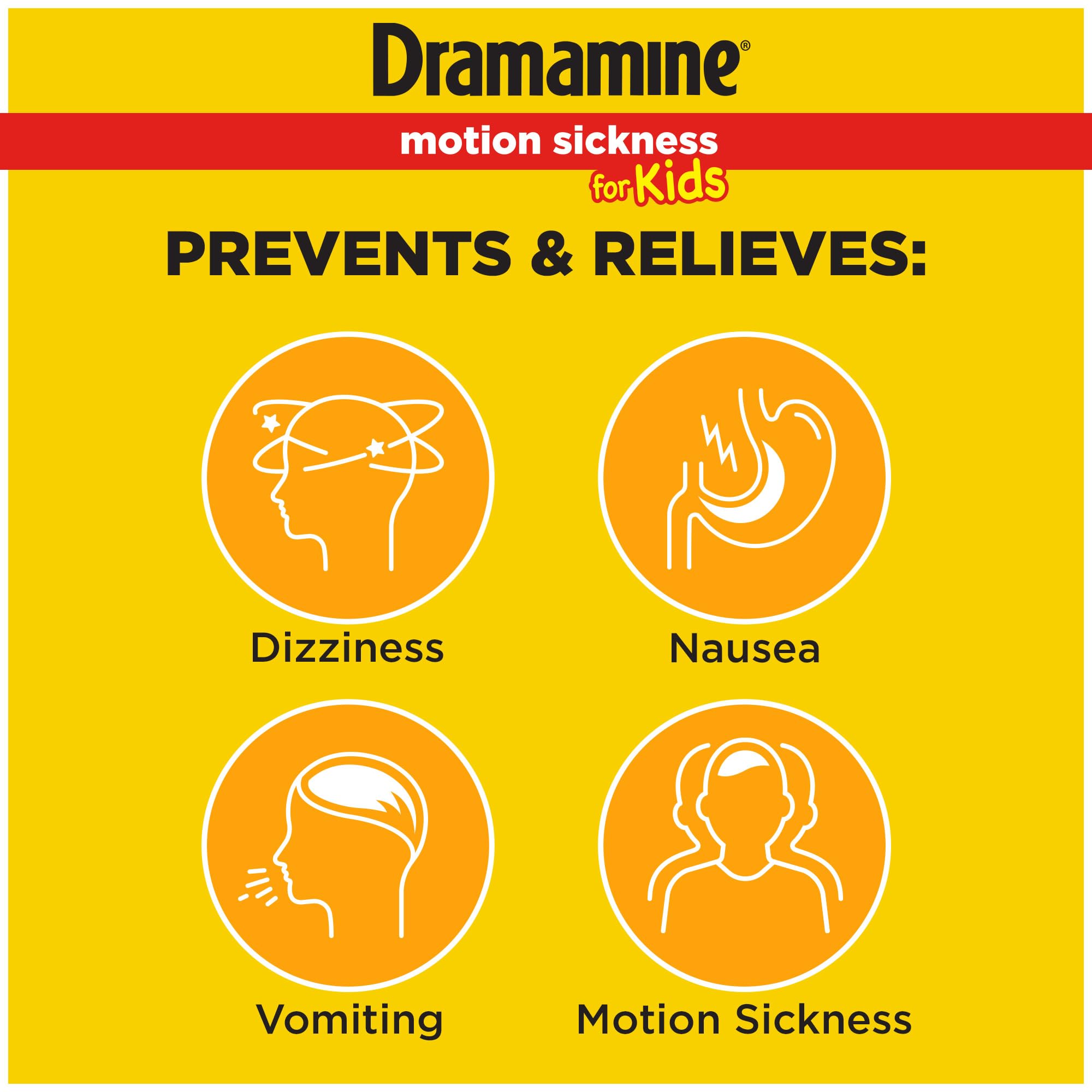 Dramamine Motion Sickness for Kids is the only medicated motion sickness relief product formulated for children, ages 2-12