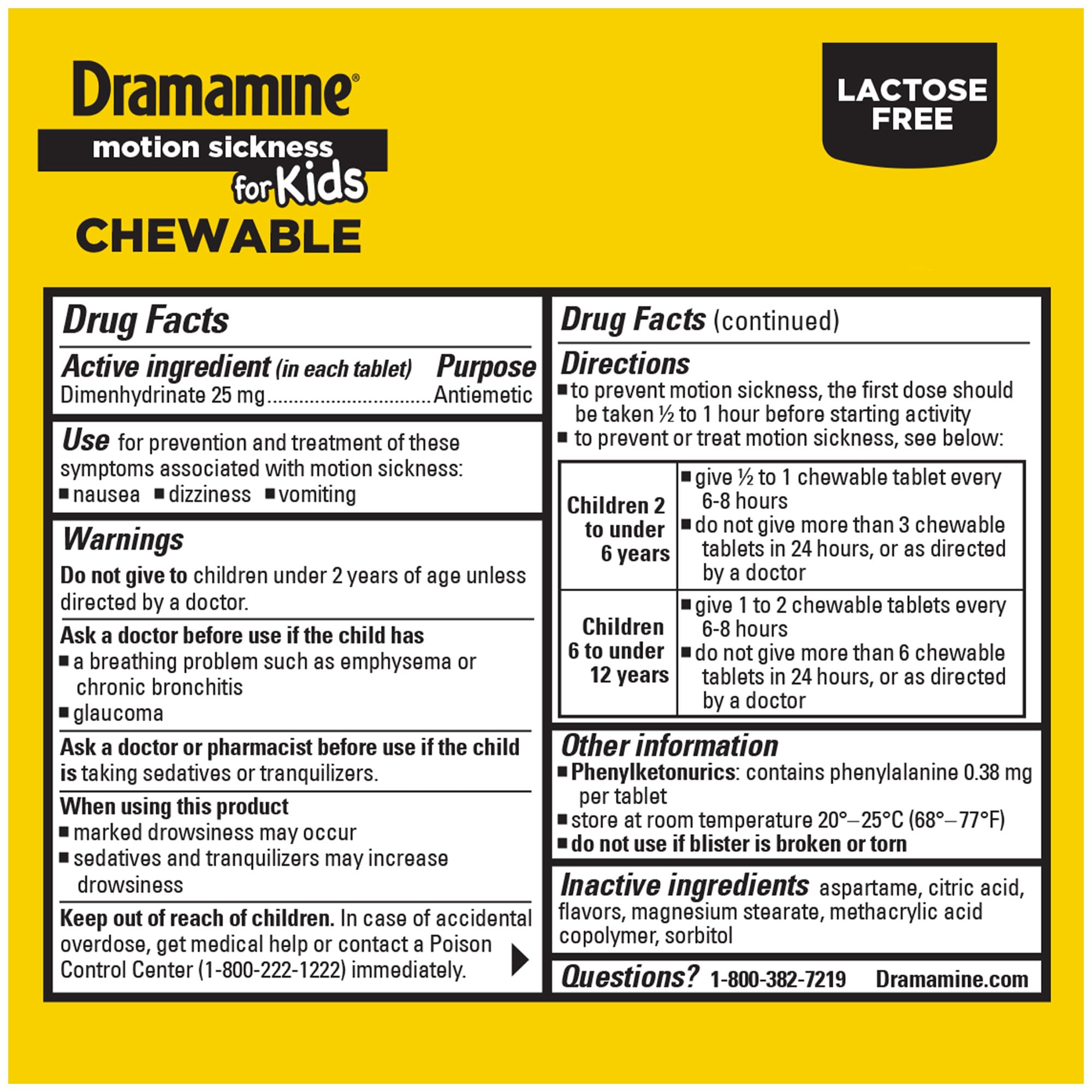 Get powerful, fast relief from the number one pharmacist-recommended brand,* in a safe, precise dose just for kids! Dramamine Motion Sickness for Kids is the only medicated motion sickness relief product formulated for children, ages 2-12. Dramamine for Kids prevents and relieves nausea, dizziness and vomiting and treats motion sickness symptoms on the spot with a dye free, fun grape flavored chewable tablet that is lactose free. Motion sickness can affect many children, commonly on road trips, theme park visits and cruise vacations. Plan ahead and be prepared with Dramamine for Kids. Easy to take along in your bag or backpack with your other vacation essentials or for any adventure. Dramamine fits with your other travel size toiletries and travel must haves. Don’t forget your other family members and consider picking up a Dramamine Motion Sickness or Nausea product. If you know your family is going on an adventure that is likely to cause motion sickness, have your child take Dramamine for Kids BEFORE the trek. Take Dramamine and Take Control. See packaging for dosing instructions and warnings. *Named by Pharmacy Times and U.S. News & World Report as number 1 Pharmacist-Recommended Brand for 2022 Motion Sickness Remedies Category.