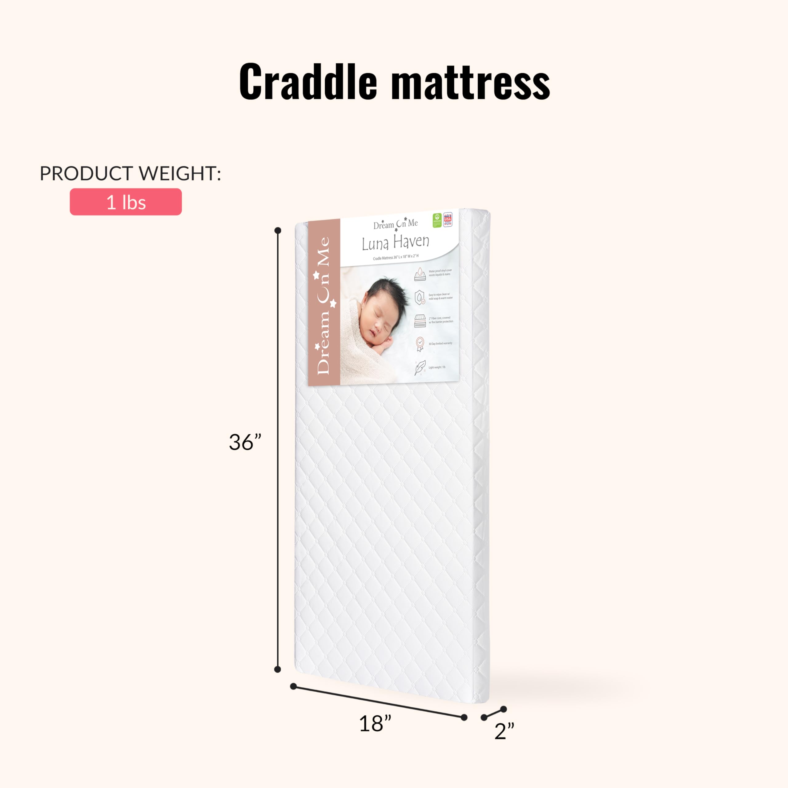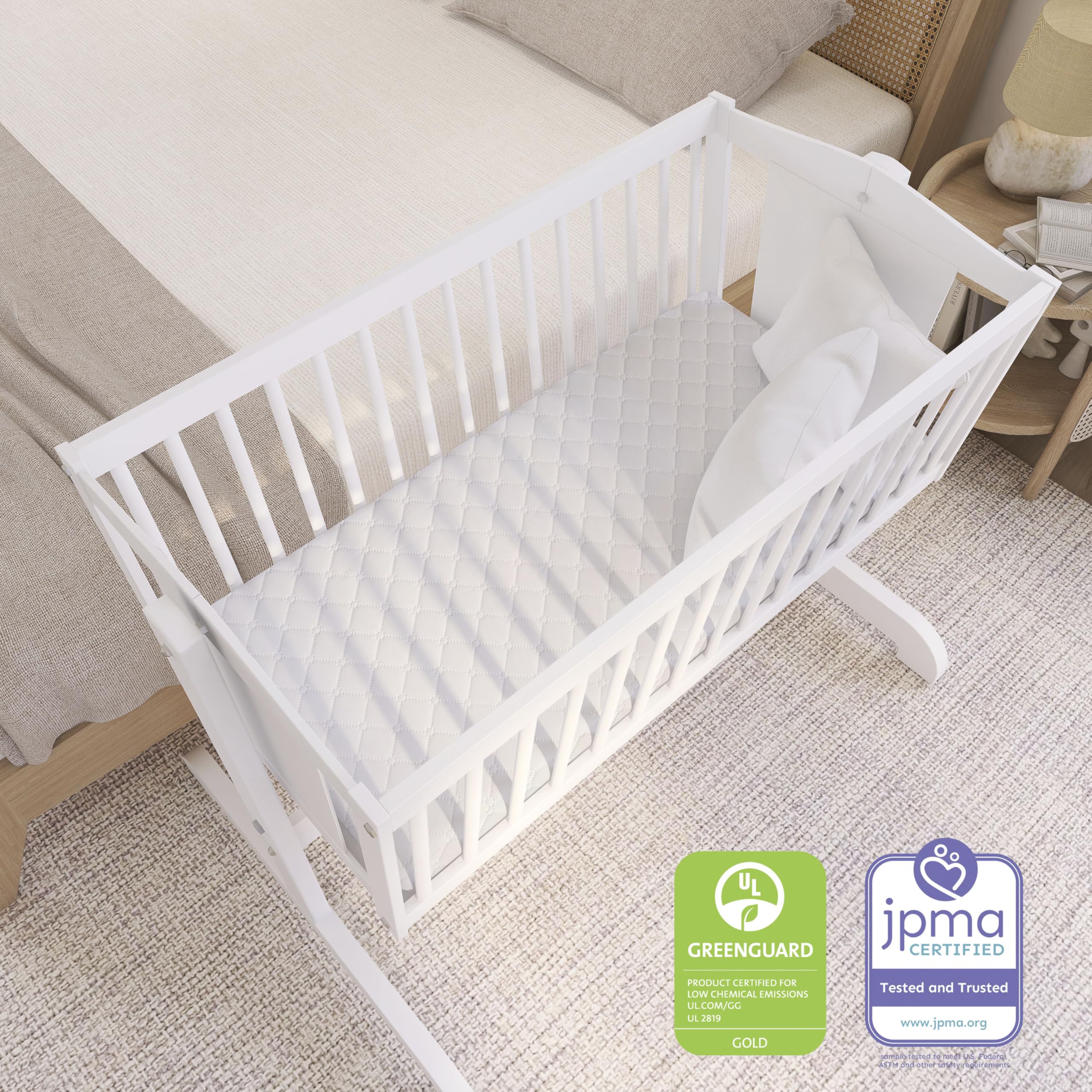 Give your baby a safe and comfortable place to rest with this cradle mattress designed for everyday support and convenience. The sturdy 1.75” polyester fiber core provides firm, even support to help promote safer infant sleep. An embossed soft vinyl waterproof cover resists stains and odors and wipes clean easily, helping maintain a fresh and hygienic sleep surface. Lightweight and portable, it makes lifting, sheet changes, and travel simple while still offering dependable comfort. GREENGUARD Gold Certified and Baby Safety Alliance Verified, this mattress meets ASTM and CPSC safety standards to support a healthier sleep environment. Measuring 36” L x 18” W x 2” H, it offers a snug, secure fit in most cradles and is crafted for long-lasting durability.
