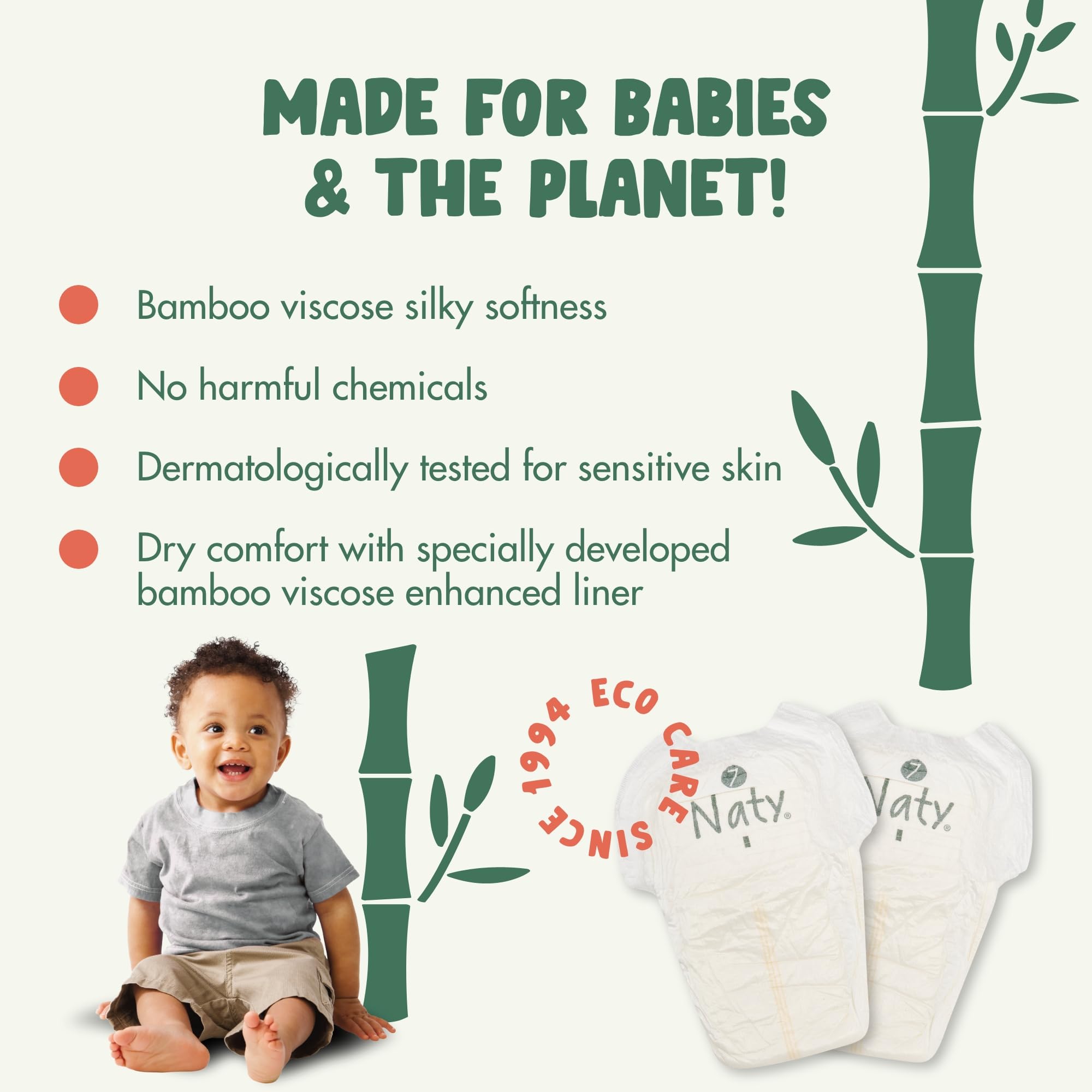 Naty Bamboo Viscose Training Pants offer a gentle solution for your babyβs delicate skin. Made with a 100% natural bamboo viscose back sheet and specially developed bamboo viscose enhanced liner, they provide plant-based softness and optimal dry comfort. A convenient wetness indicator helps you know when itβs time for a change. These Training Pants are designed for superior comfort and absorbency, featuring breathable materials and a multi-layered, advanced core that locks away wetness quickly, keeping your baby dry for hours. With strong leak protection, Naty pull ups ensure long-lasting dryness for both day and night use. Perfect for sensitive skin, Naty training pants are hypoallergenic and free from harmful chemicals. They contain no fragrances, lotions, chlorine, latex, dioxins, phthalates, or dyes. They are certified by OEKO-TEX Standard 100 and dermatologically tested by Dermatest with an "Excellent" rating. The flexible, stretchy fit ensures comfort as your baby grows. Elastic waist and leg cuffs offer a snug, comfortable fit. Available in sizes 1-7 for diapers and sizes 3-7 for training pants, they adapt as your baby transitions from newborn to toddler.