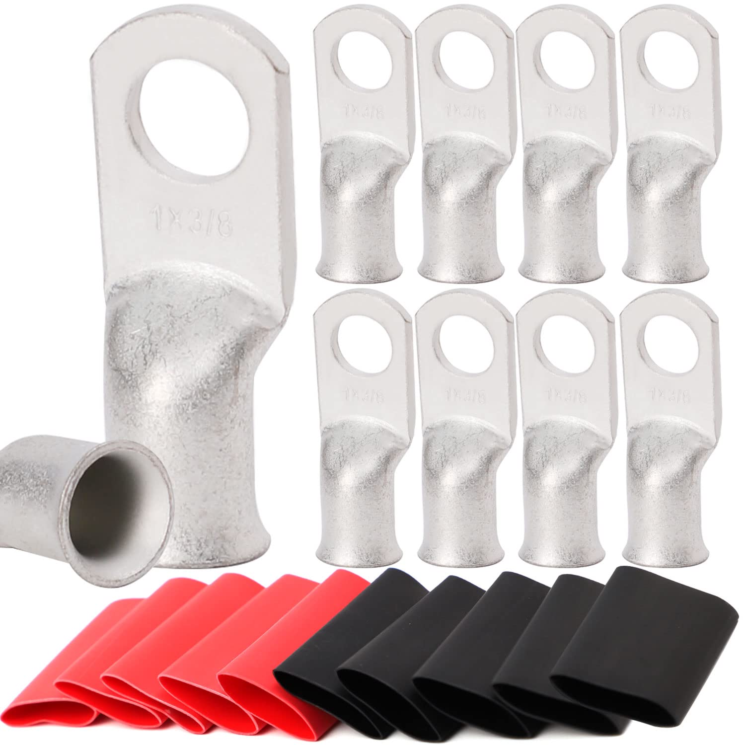 【What You Get:】 10Pcs per pack of 1 Guage (AWG) 3/8" marine grade tinned copper lugs ring terminals closed end termination ring terminals with 10 Pcs 3:1 Dual Wall Adhesive Heat Shrink Tubing Tube for your work(5pcs Black and 5pcs Red).