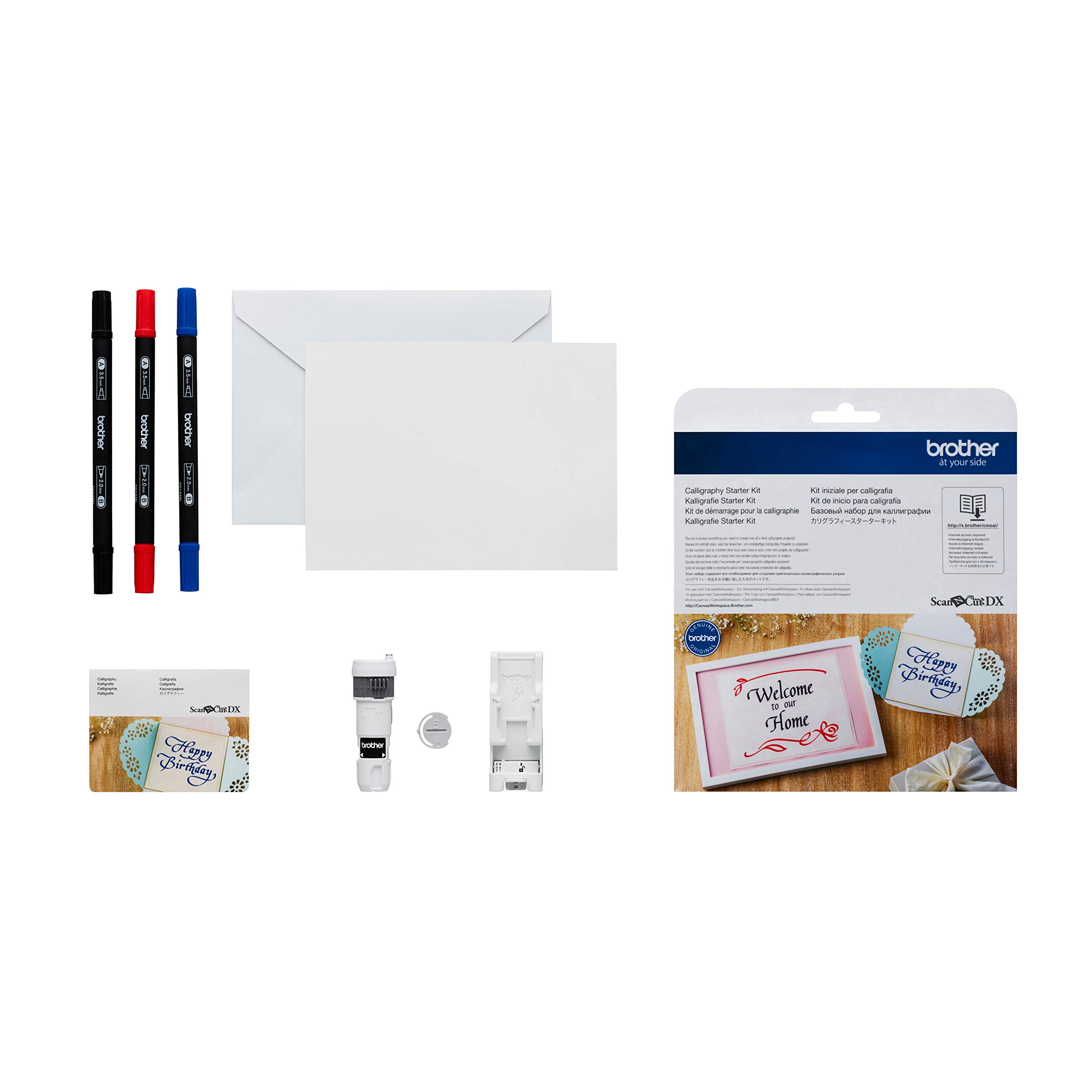 Includes what you need to get started: Calligraphy Pen Holder, Calligraphy pen stand, Pen adjuster A (For 3. 5 mm pen tip) and B (For 2. 0 mm pen tip), Three calligraphy pens (Black, Blue & Carmine Red), Activation Card for access to italic font and 30 calligraphy patterns, Sample card (5” x 7”) and envelope (5. 2” x 7. 2”)