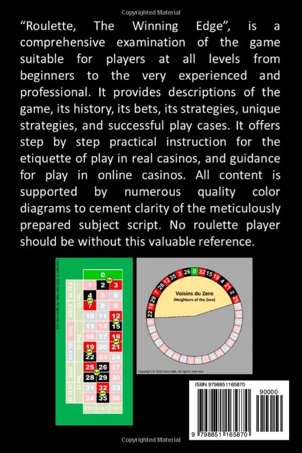"Roulette, The Winning Edge" is an essential reference and effective play guide for the casino game of roulette. It provides, with clear examples and illustrations; the basic principles of the game; how to play practically in a casino or online; strategies that can be applied to improve success and extend play; a history of the game; successful exploits that beat the casino; a technical explanation of roulette wheel biases; a technical explanation on dealer signatures; progressive numerical strategies; momentum strategies; variance tracking strategies; minimum limit reduction techniques; general tips and tricks.