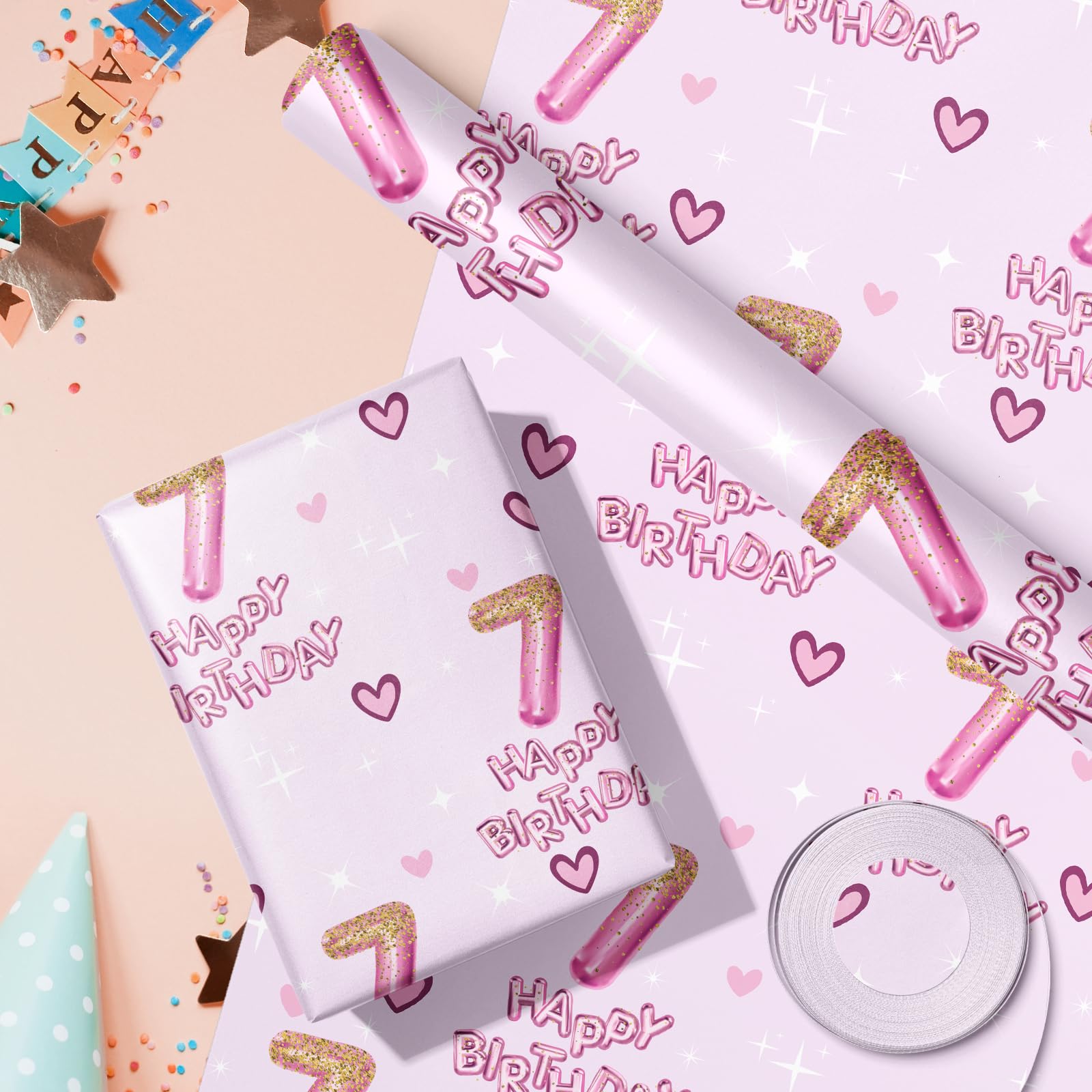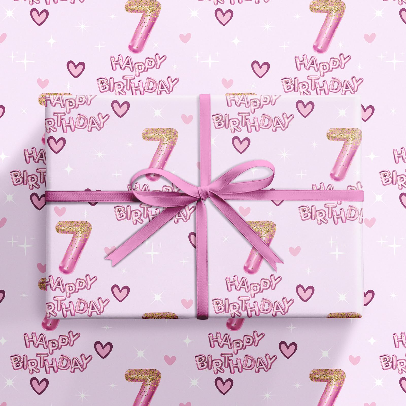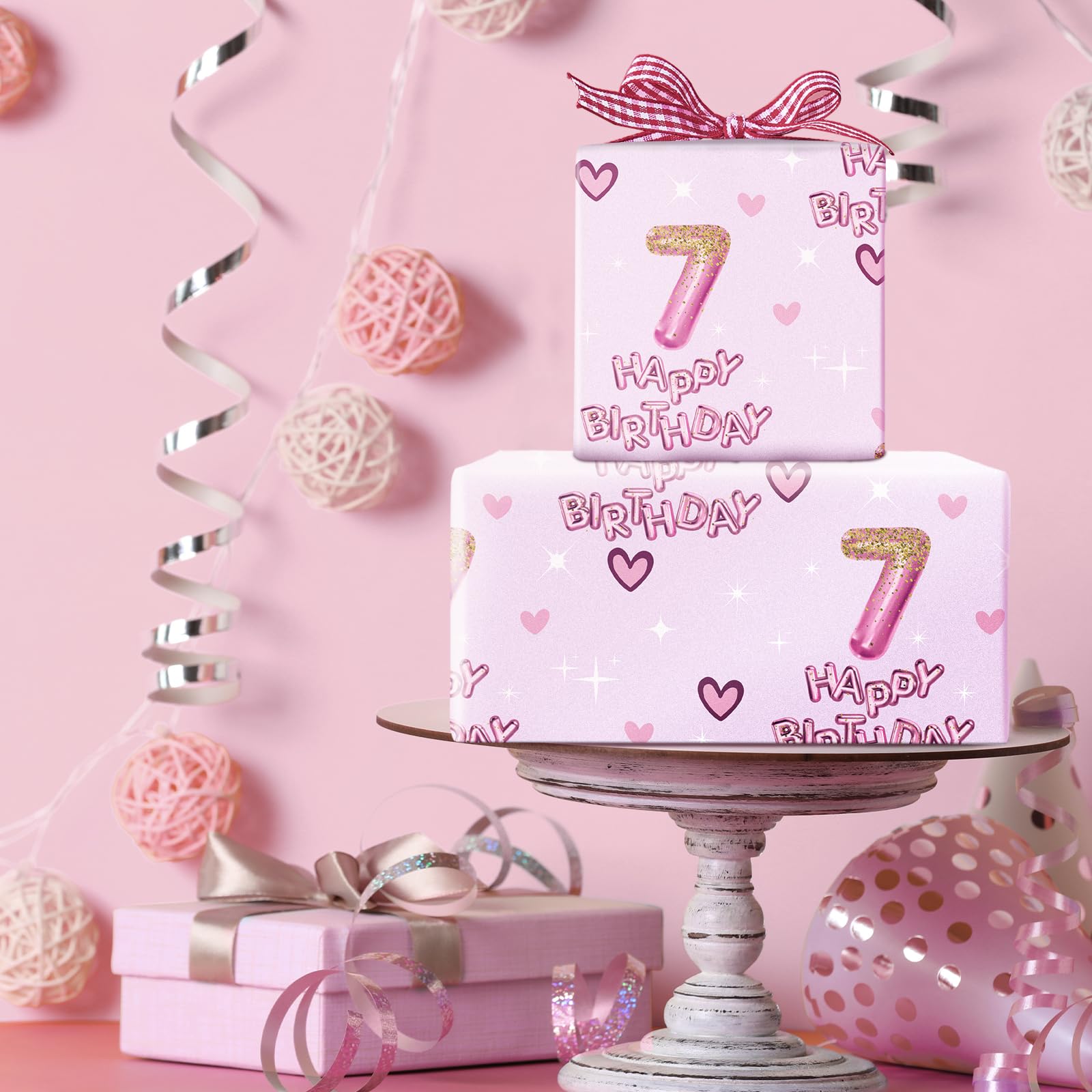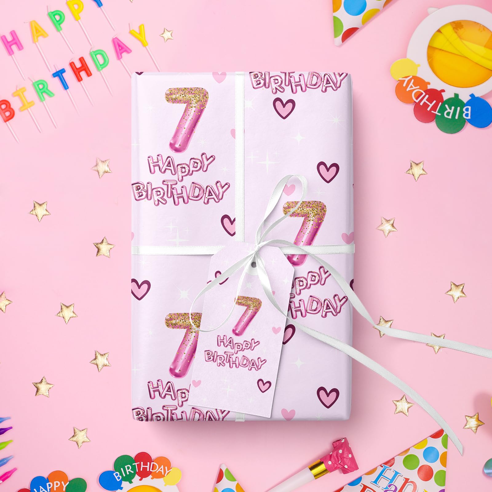 Vibrant Design: Wrapping paper printed pink number 7 balloons, hearts and "HAPPY BIRTHDAY" text on pink background that adds excitement to any gift, making it perfect for girls' birthday parties