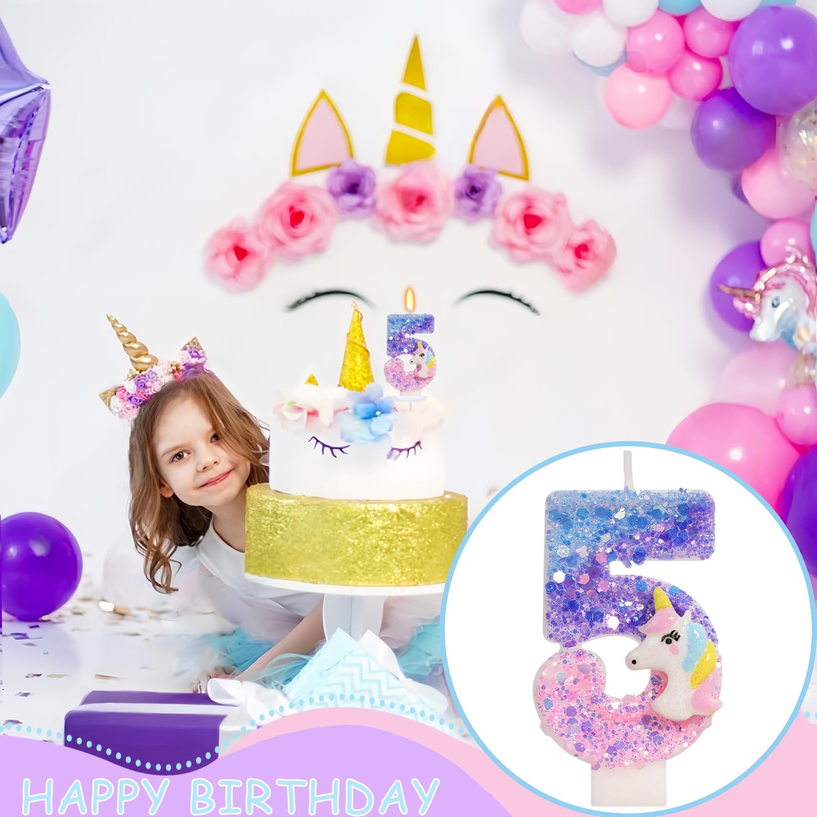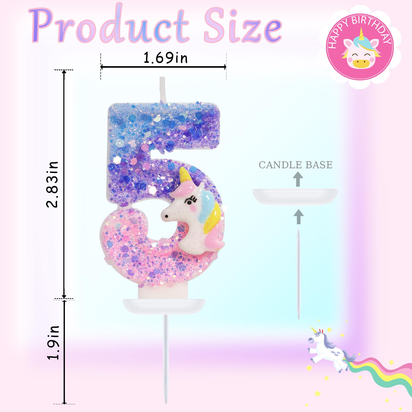 Product Design: A colorful unicorn birthday candle series, with a pink purple gradient glitter that twinkles under the reflection of light. The dreamy color and cute design are very eye-catching