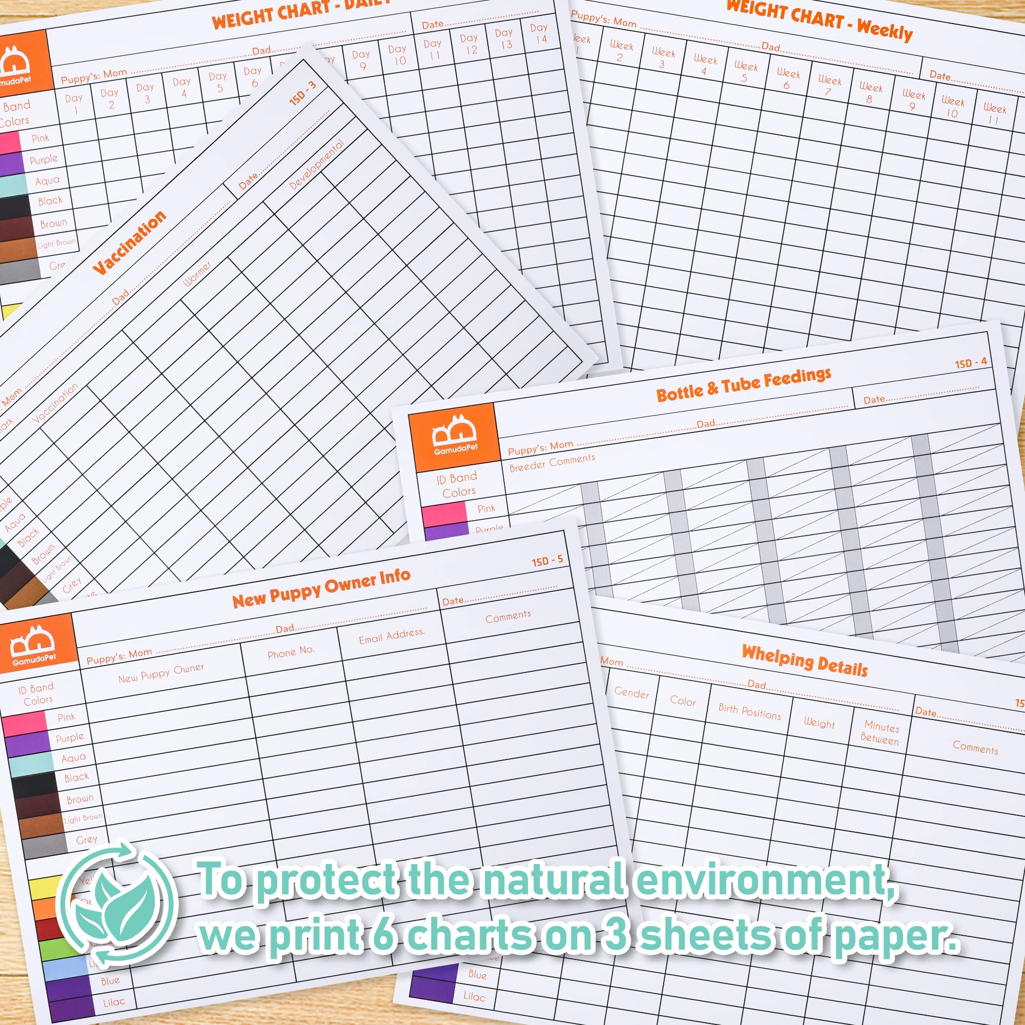 STYLISH & RELIABLE: The upgraded 15-Color puppy whelping collars provide great solution to identify your pups without effort. 6 Record Keeping Charts: Keep records of whelping details, weight gain (daily & weekly), bottle & tube feedings, vaccinations & worming, time of birth, new owner information. These charts make tracking your litter without effort and a perfect way to show new owners. To protect the natural environment, we print 6 charts on 3 sheets of paper.
