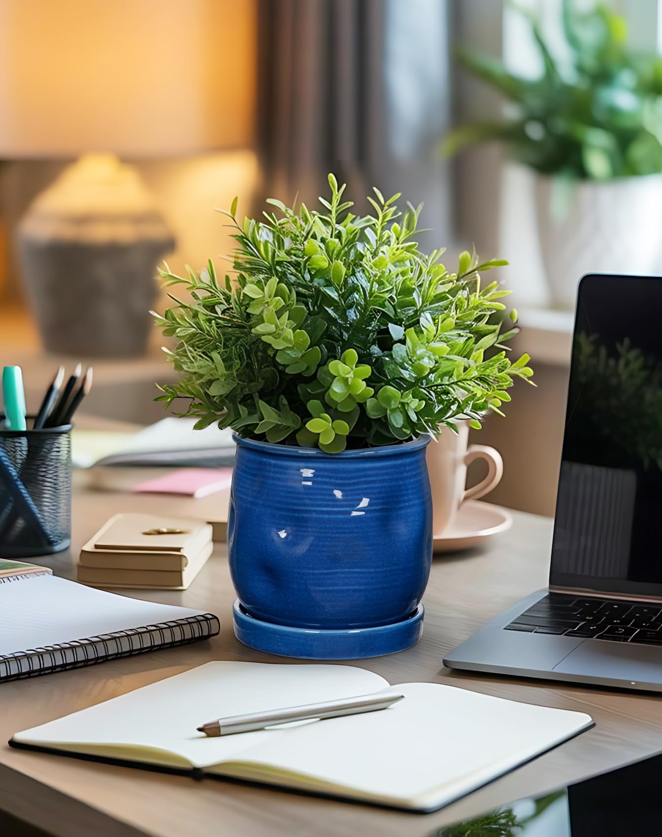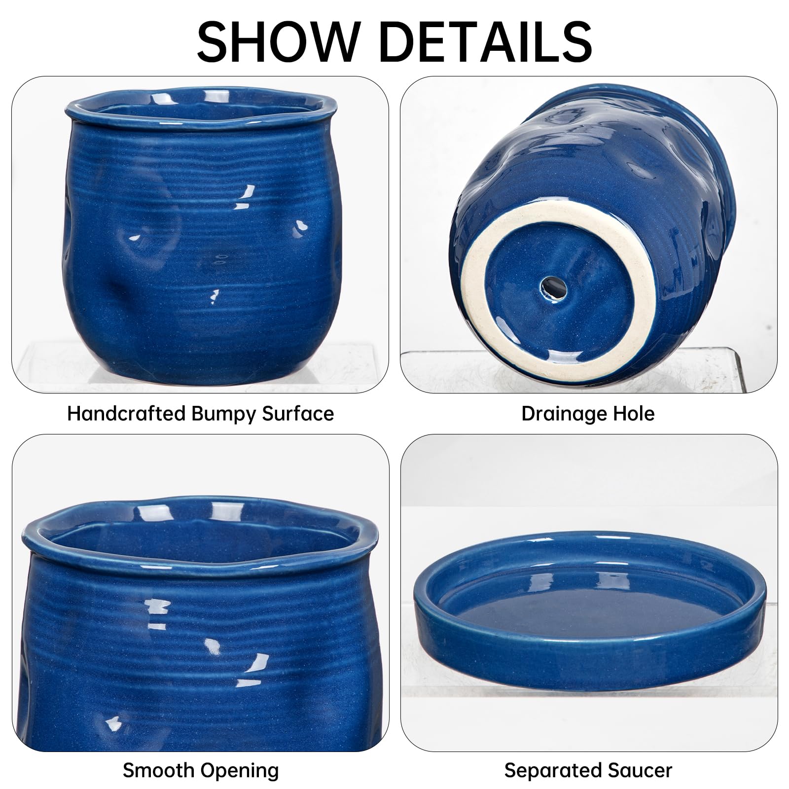 Decorative Ceramic Pots for Plants - Elevate your space with this artisan crafted ceramic planter, featuring a charm blue glaze finish. Its unique hand-shaped bumpy texture, wavy rim, and contrasting blue accent line create a one of a kind, organic aesthetic. The minimalist cylindrical shape and matching saucer offer a timeless look perfect for adding a touch of nature inspired artistry to any modern, boho, or farmhouse style room
