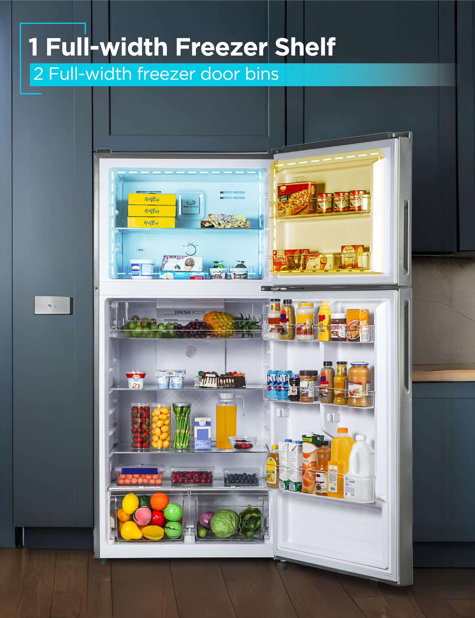 Top Freezer: Our deep freezer has a removable glass freezer shelf ideal for frozen meals, packaged meats, leftovers, ice cream, and other foods. Removable to make space for larger items