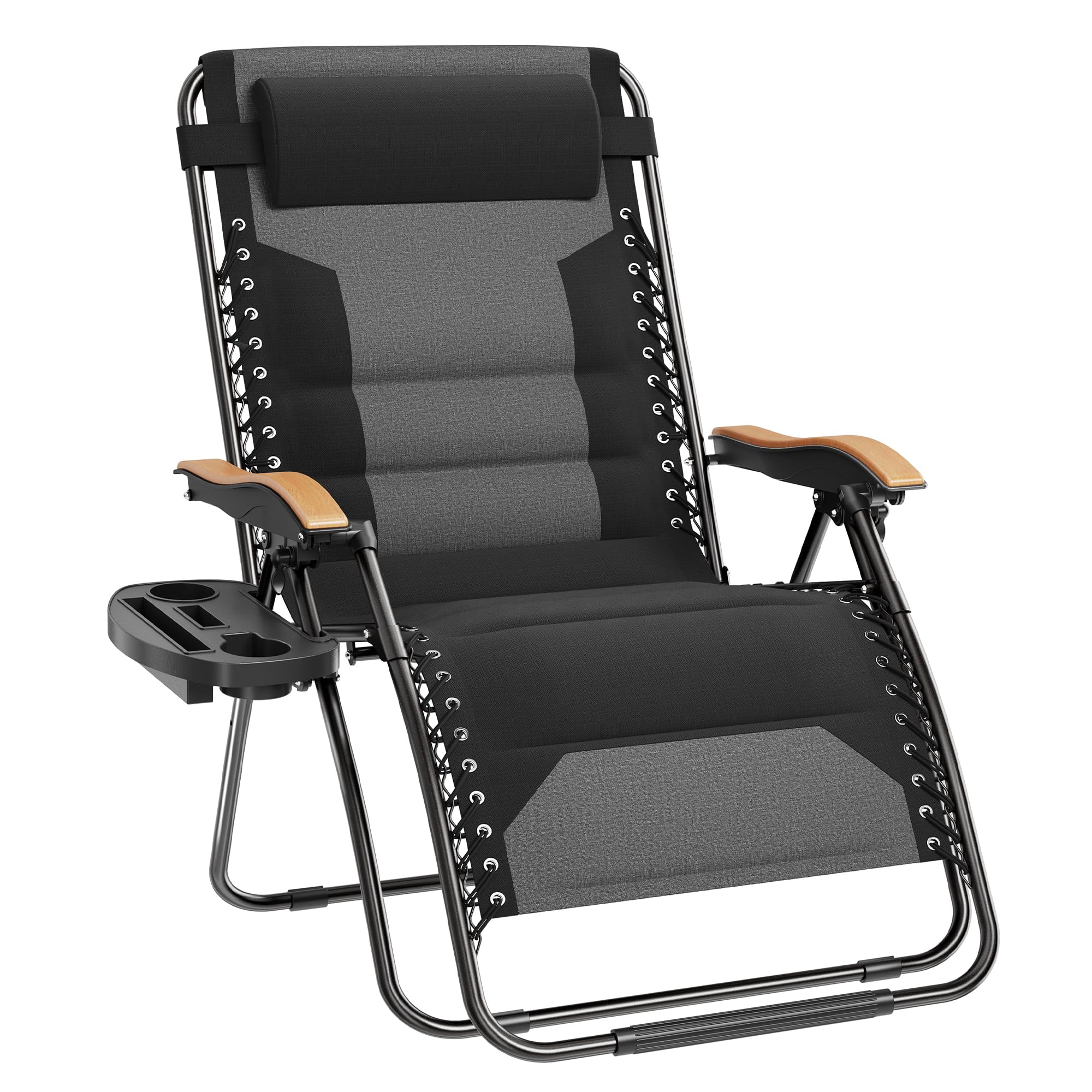 Padded Seat & Back: Fully padded seat suspended by double bungee system provides more comfort and durability. Extra-large wood-like pattern armrest provide more comfort. Cup tray is included for holding drinks or food