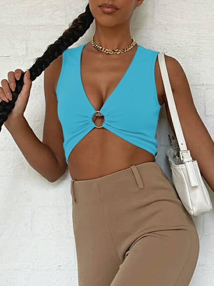 Design of the deep v neck and the silver ring center piece keeps the y2k top away from the ordinary. This cute tops can go well with jeans, shorts and high heels well