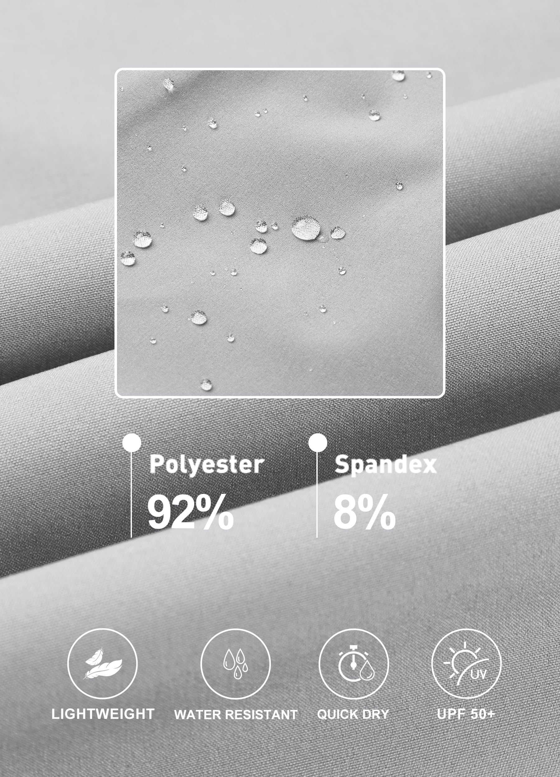 UPF 50+ treatment provides excellent UV protection. Water resistant capacity helps resist light moisture