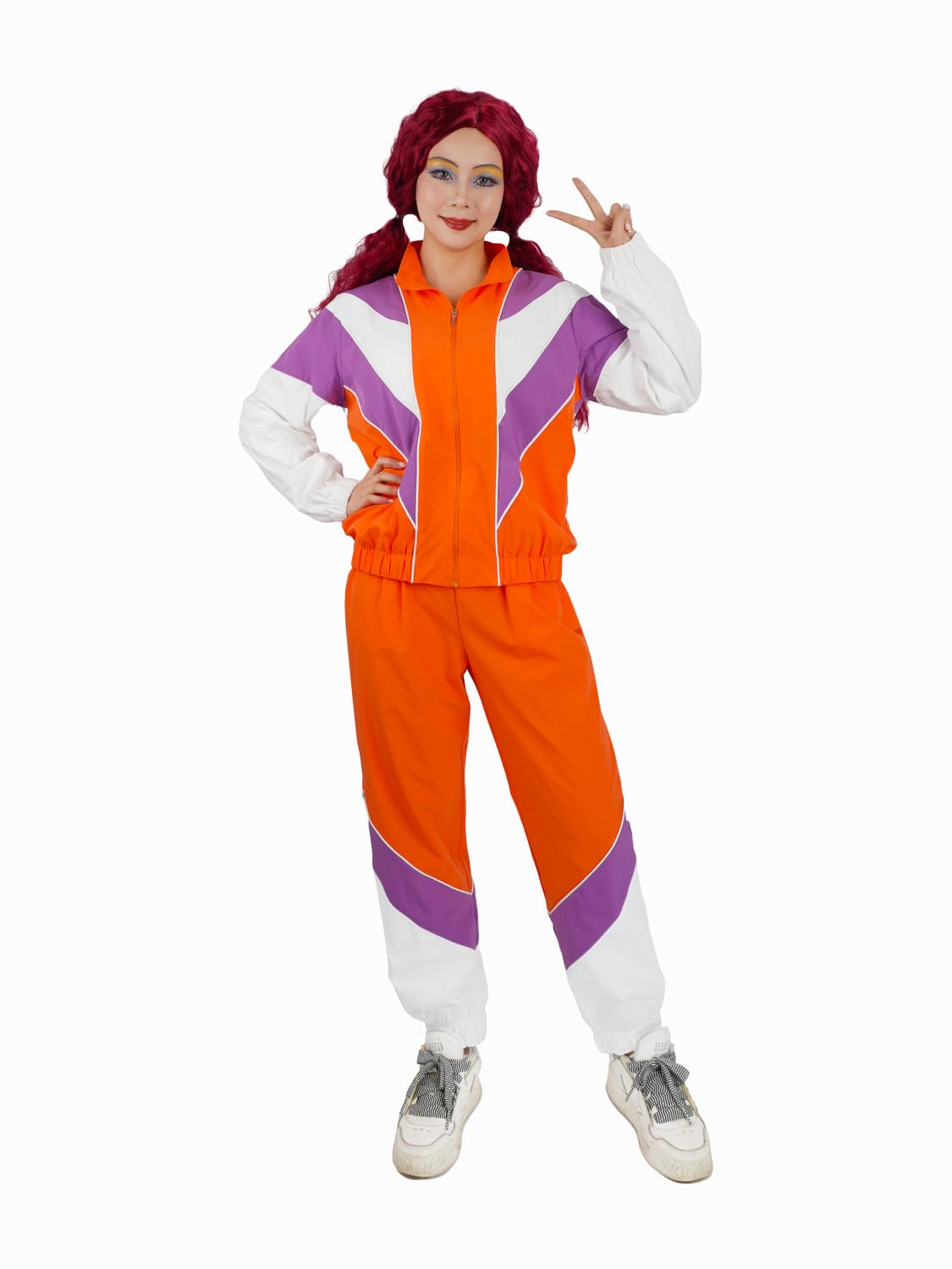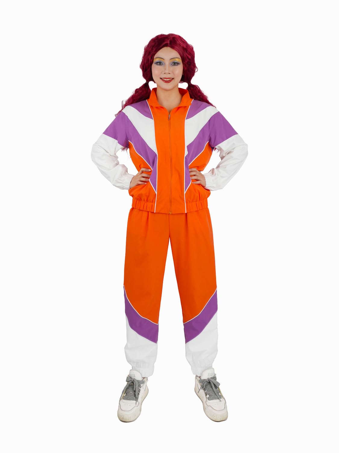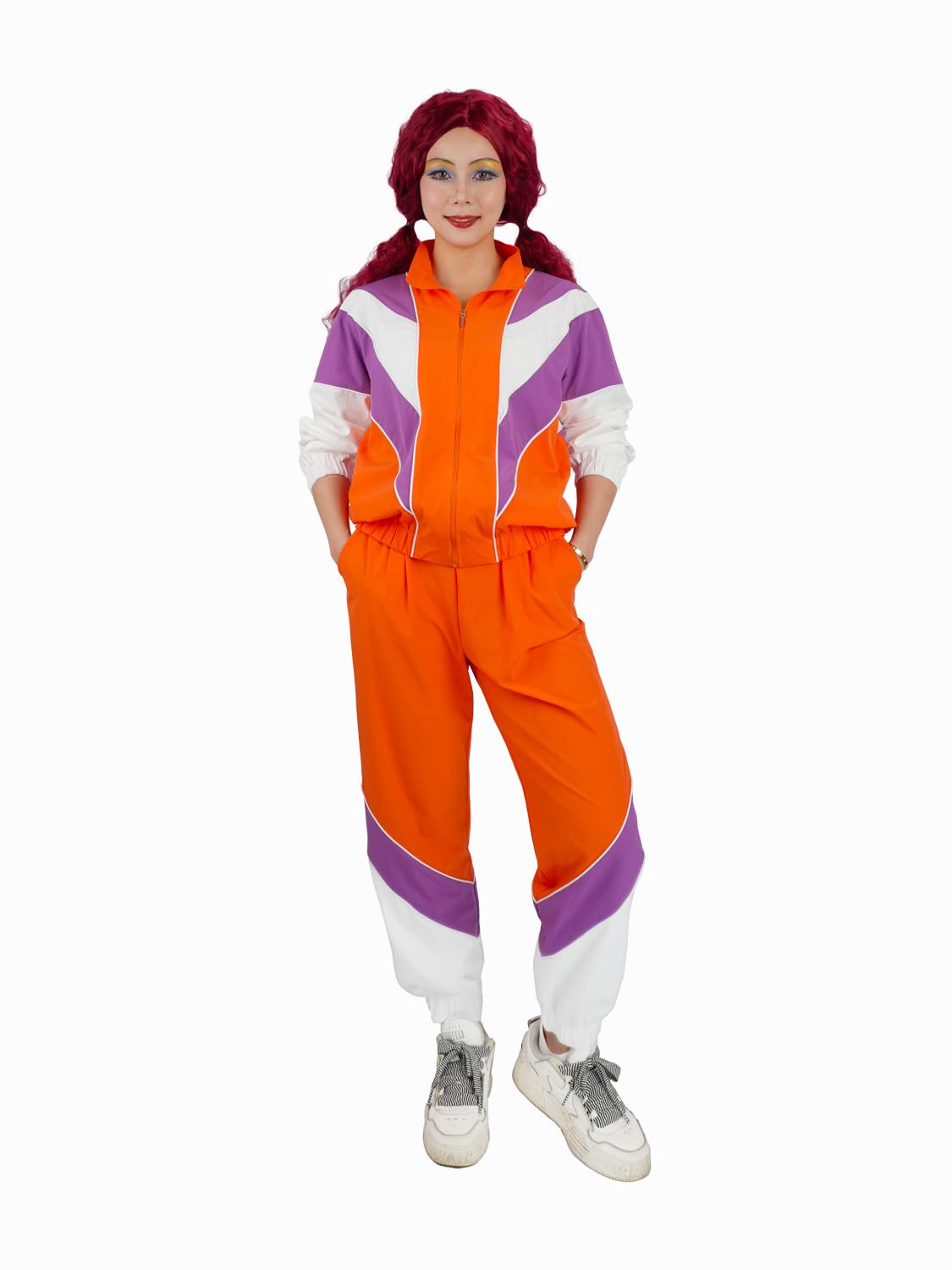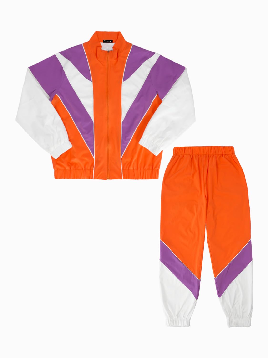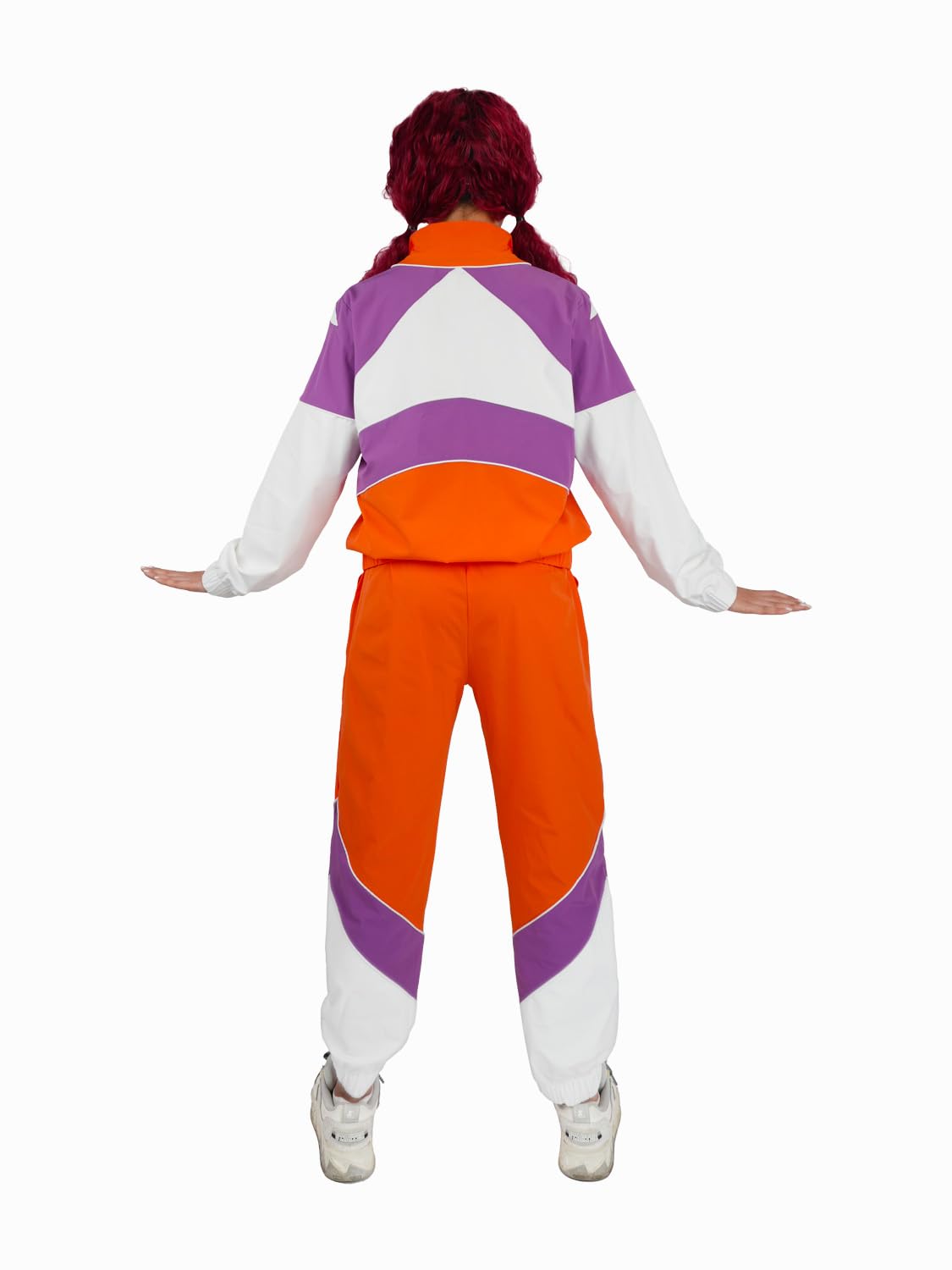 Vibrant Retro Style: Turn heads with this bold and colorful retro sports suit! Featuring a striking combination of orange, purple, and white with classic geometric patterns, it captures the essence of vintage athletic fashion. Whether you're hitting the track or making a statement at a costume party, this suit delivers unmatched 80s and 90s nostalgia.