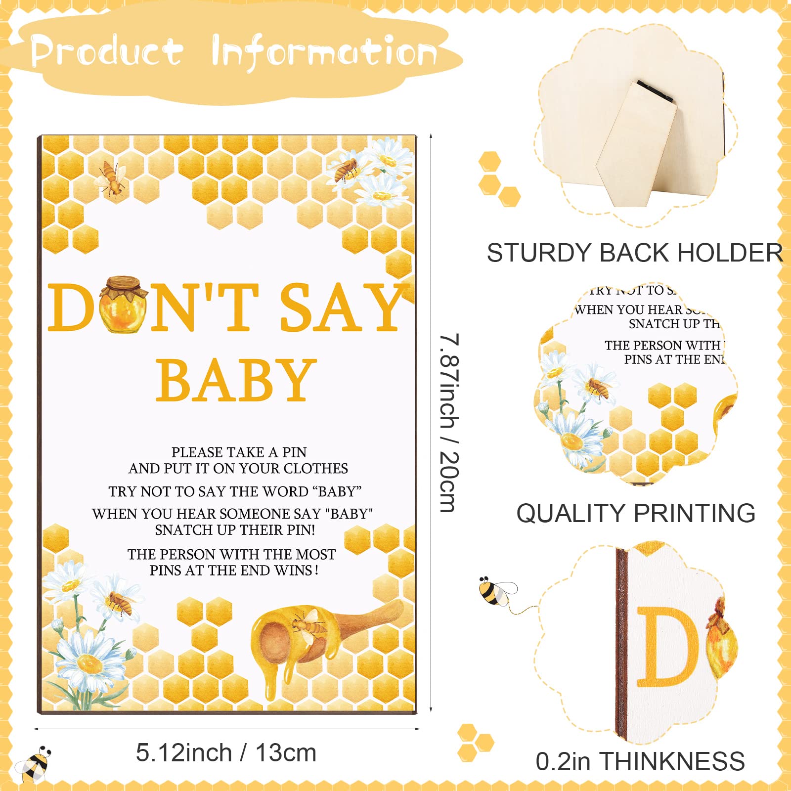 Size Details: the stand sign of this bee theme don't say baby game measures approx. 5.12 x 7.87 x 0.2 inch, each mini bee clothespin is about 1.18 x 0.28 inches, the proper size for you to decorate your party