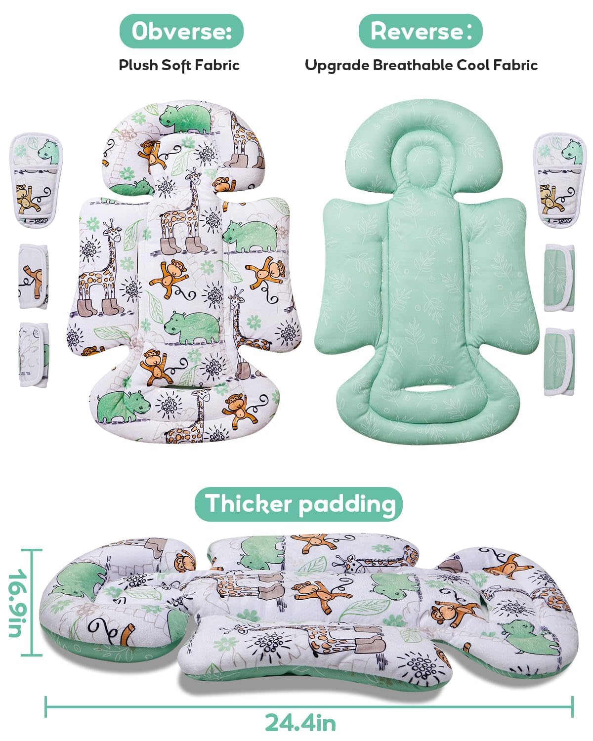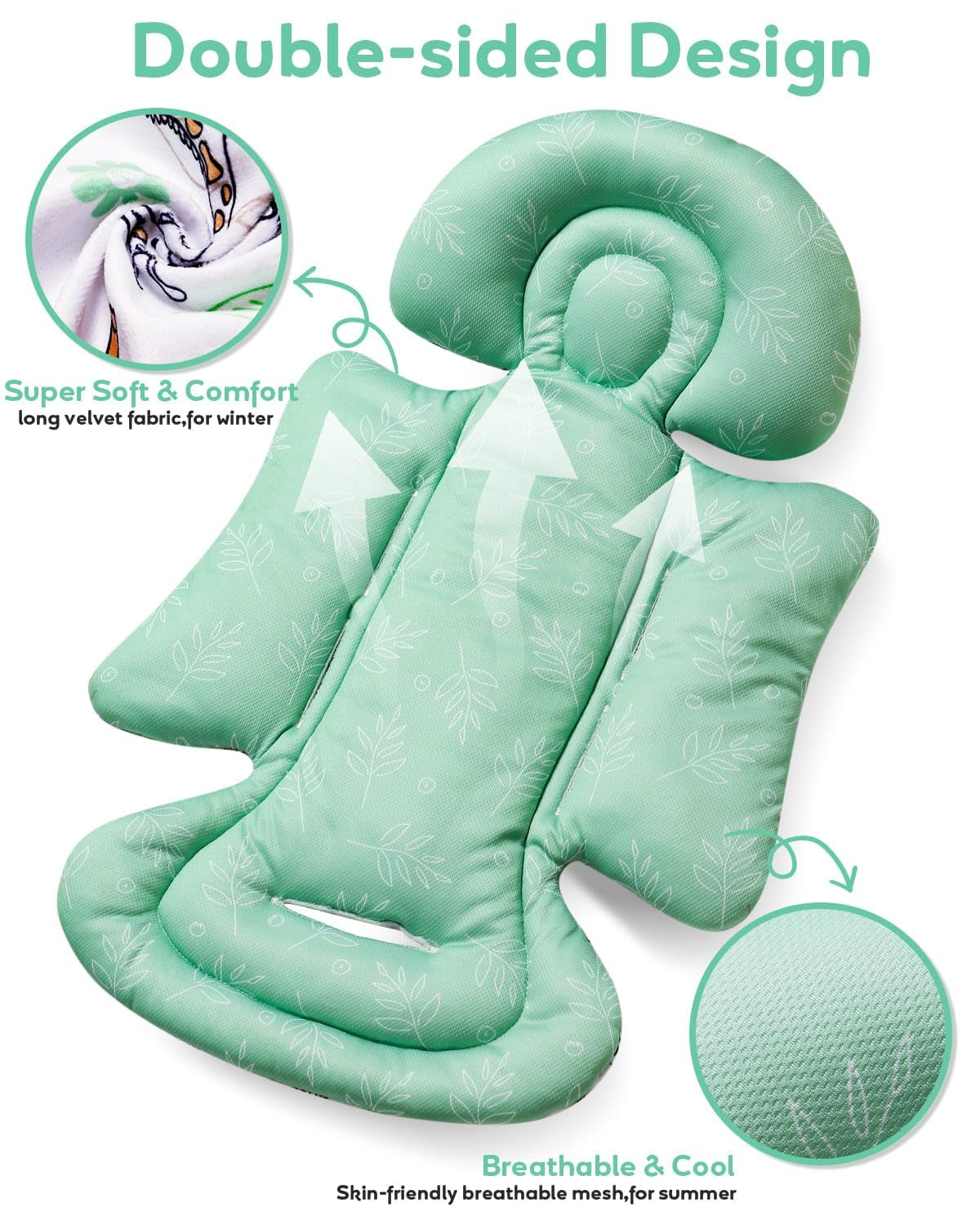 Revesible for All Seasons: A double-sided infant car seat insert newborn. One side is made of plush fabric for super softness, the other side is made of breathable cool Wicking mesh fabric, keeping your baby cozy and cool in the carseat or swing all year round. Pick one side according to the season