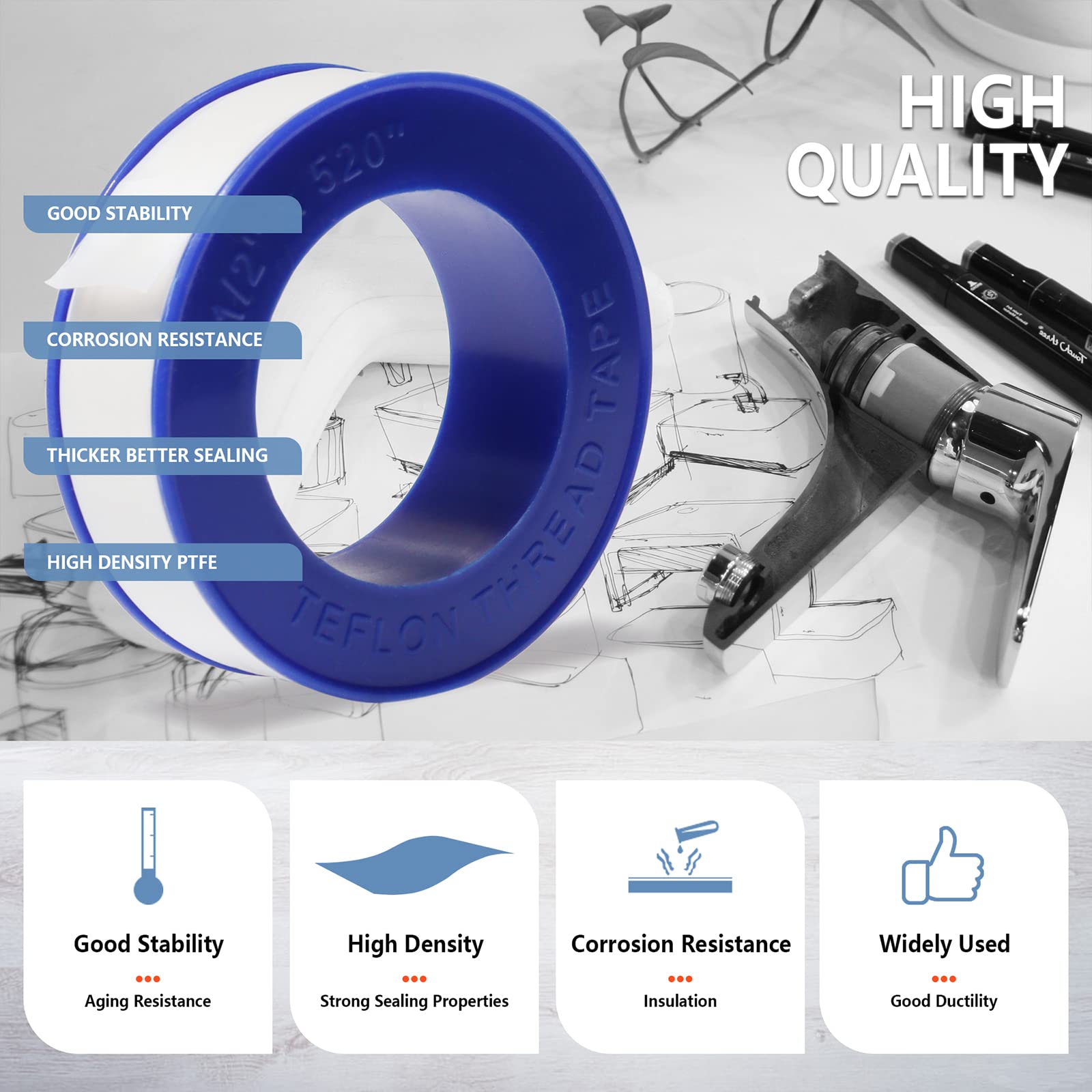 SIZE: Each roll of teflon tape is 1/2 inch wide and 520 inches long,greater thickness and density.