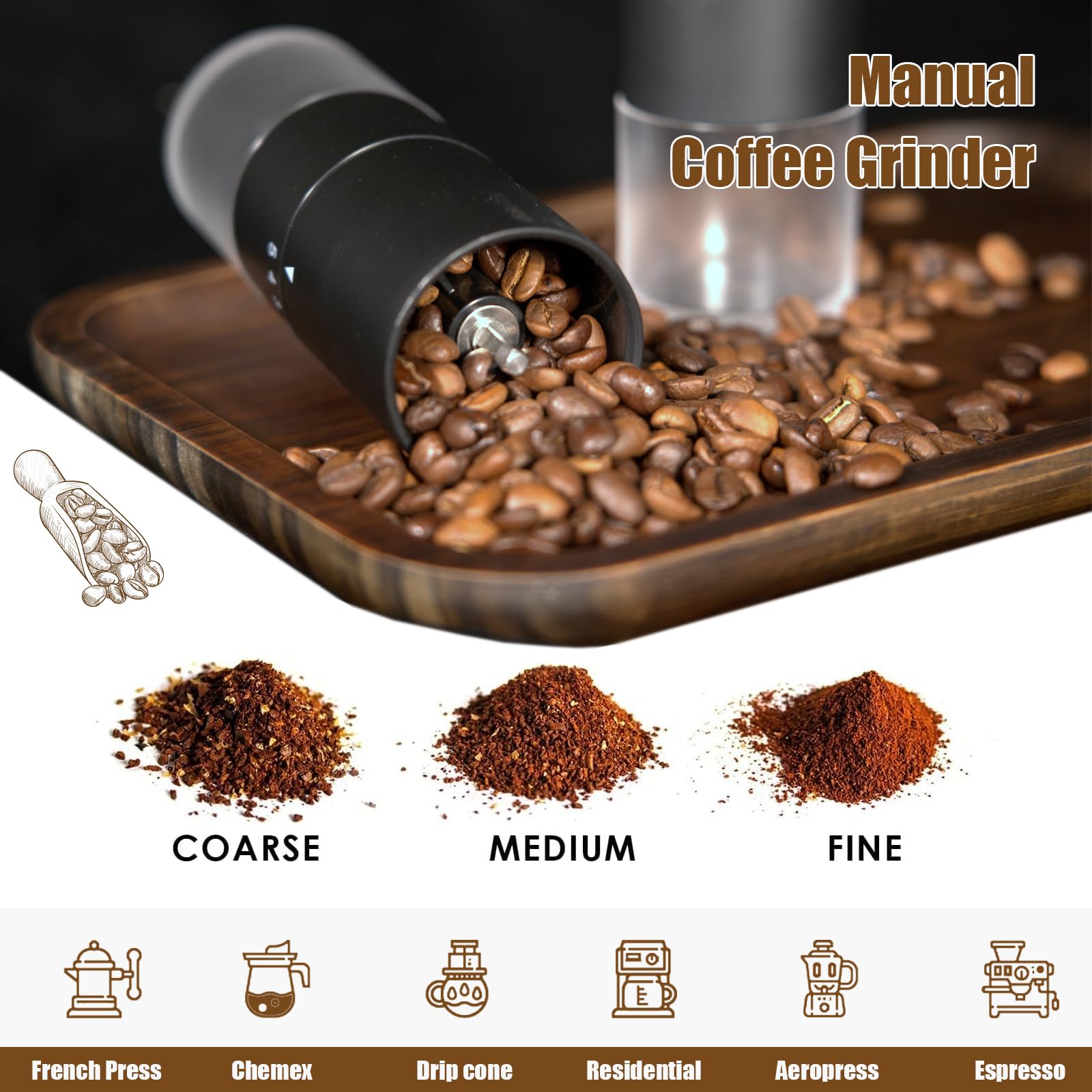 ENHANCED FLAVORS: Elevate your coffee ritual with our manual coffee bean grinder, boasting a ceramic conical burr for consistently superior flavors from the world's finest beans. Immerse yourself in the enticing aroma of freshly ground coffee as you prepare espresso, drip coffee, French Press, or pour-over brews