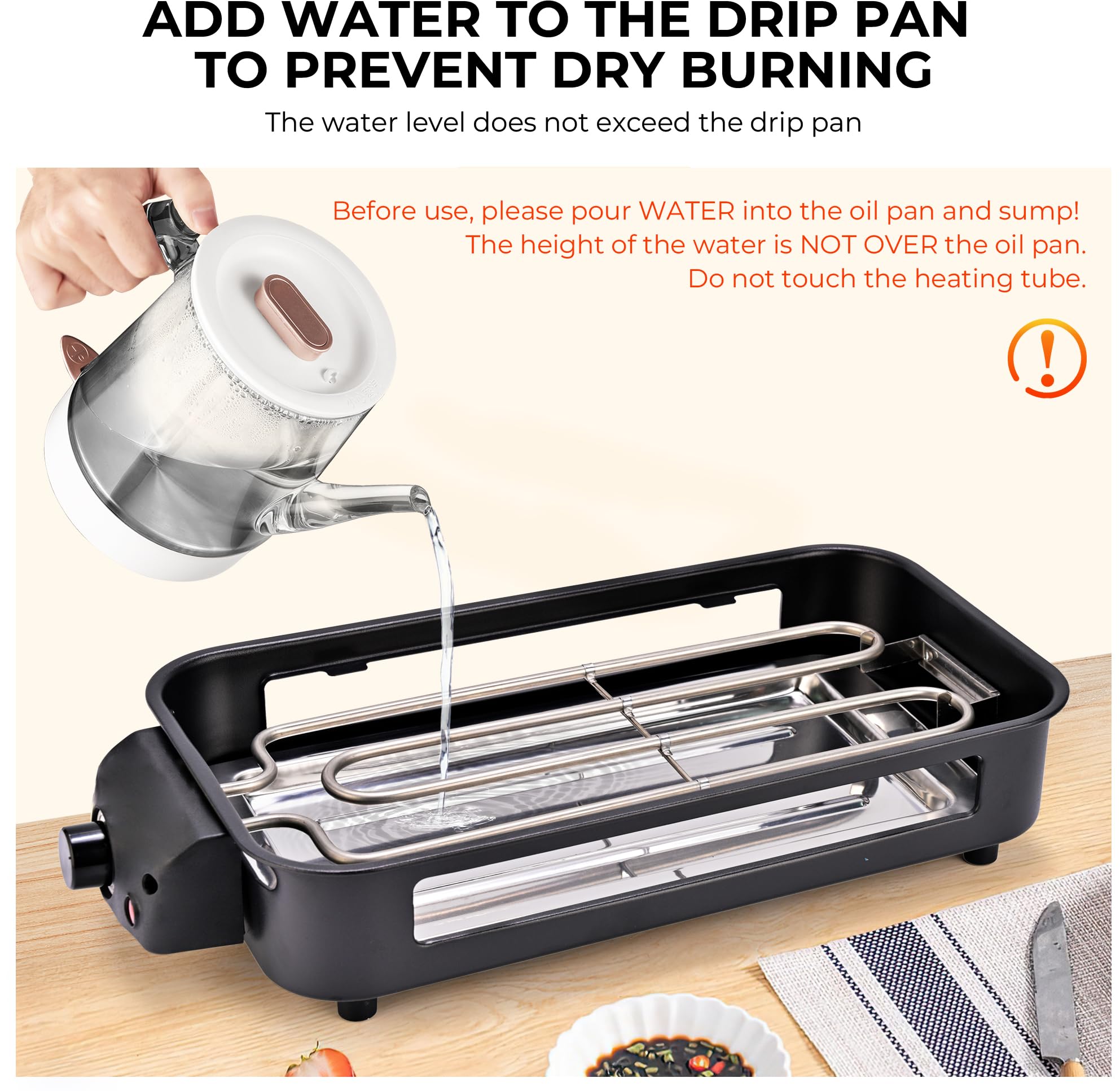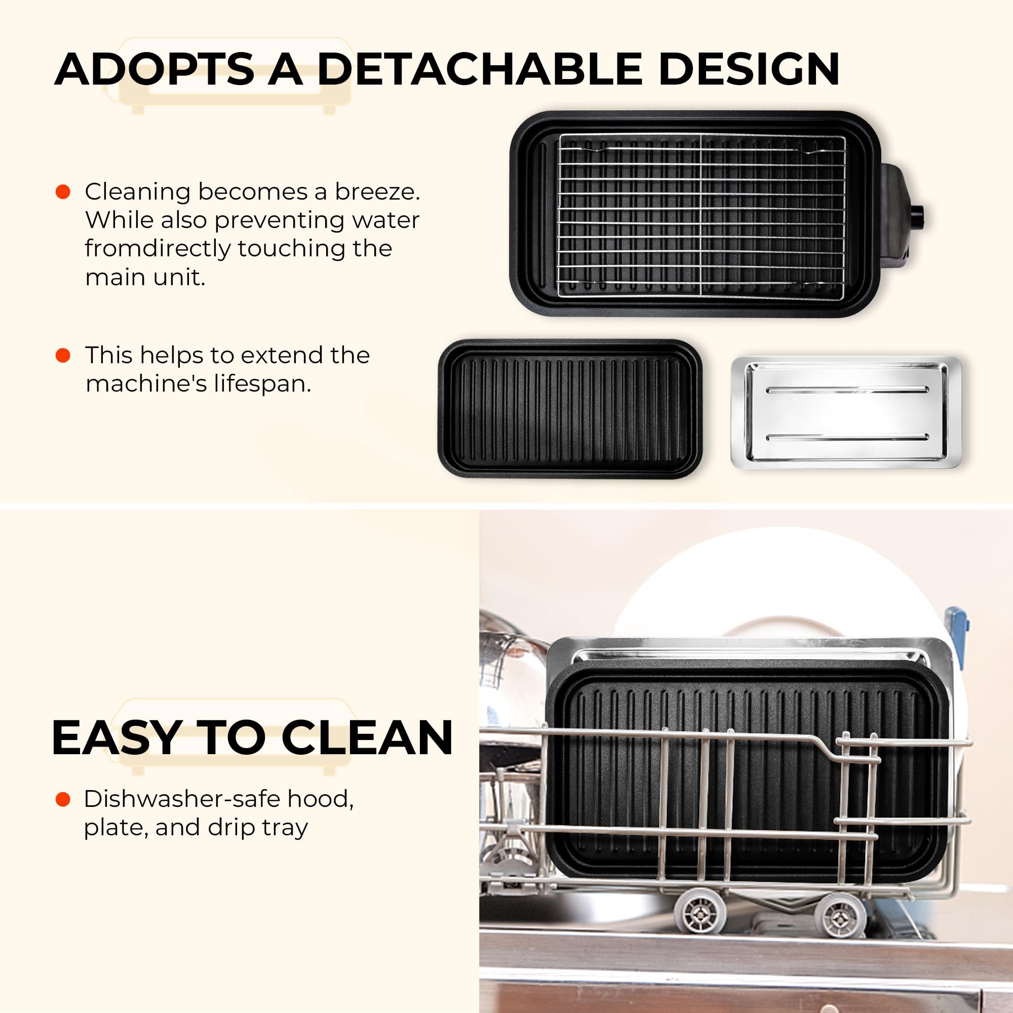 【RAPID HEATING & CONSTANT TEMPERATURE】The indoor smokeless grill for kitchen comes with a large Non-Stick grilling plate 16 x 9 inch, making it great for parties and family fun with delicious food. With 1500 watts power smokeless indoor grill effortlessly melts cheese, cook up meats, veggies and seafood just in minutes