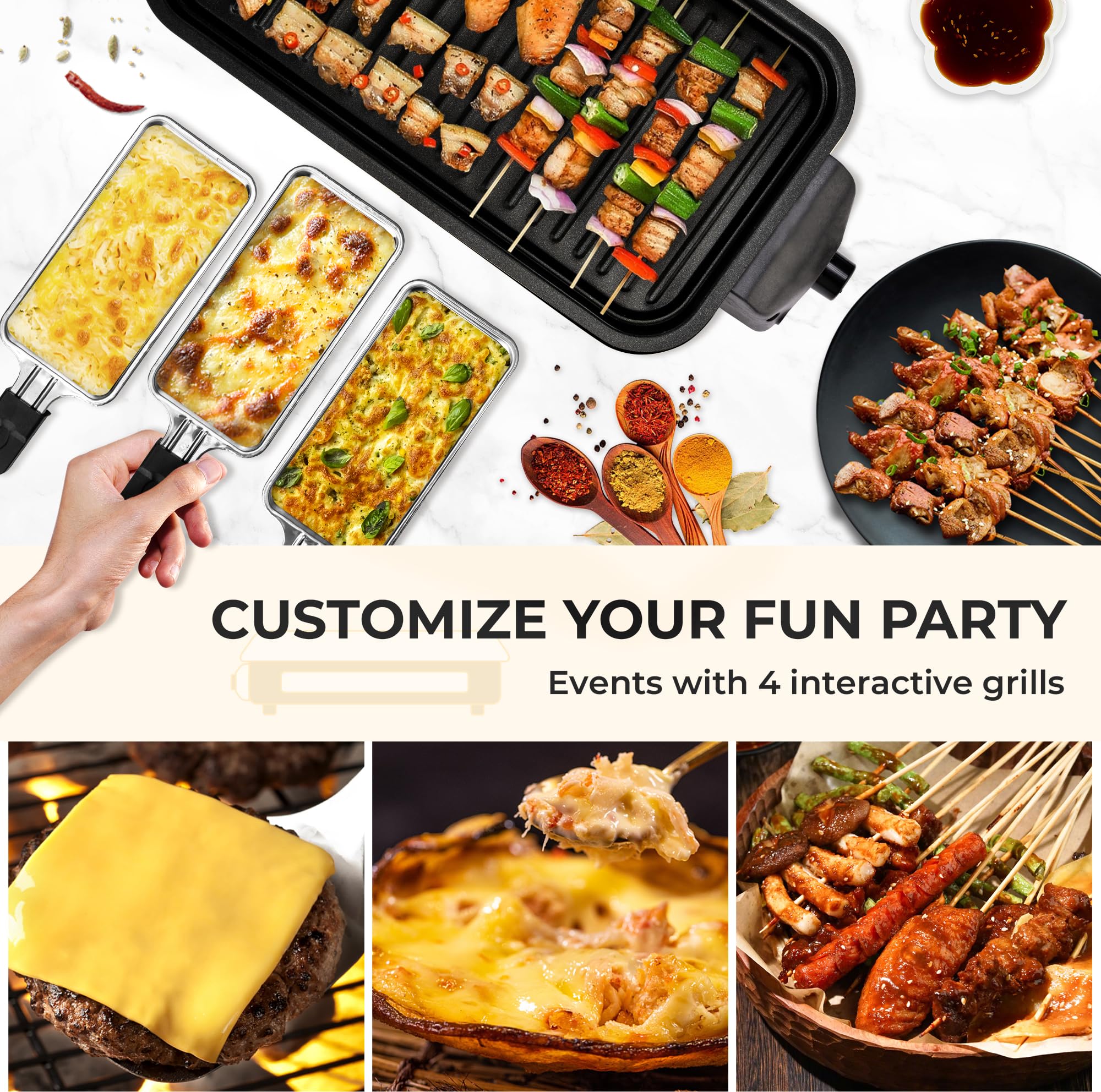 【RACLETTE TABLE GRILL FOR TWO PERSONS】This indoor grills electric smokeless is perfect for small families, couples, and individuals living alone. It comes with 3 mini raclette pans, providing enough space for grilling. Simply plug in the electric grill, set the desired temperature, and prepare low-fat, healthy meals with ease