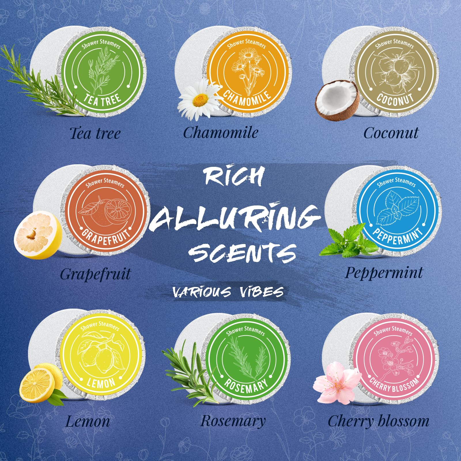 Alluring Scentswith Rich Layers: The shower steamer set features a rich array of alluring scents, offering various options to meet your needs. Enjoy fragrances with multi-layers like Rose, Lavender, Chamomile, Eucalyptus, Peppermint, Tea Tree, Lemon, Citrus, Jasmine, Pineapple, Cucumber, Lemongrass, Rosemary, Cherry Blossom, Grapefruit, and Coconut.
