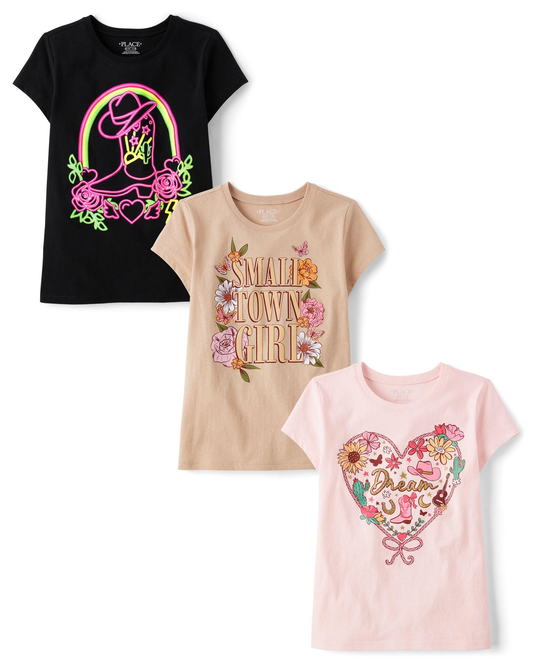 MULTIPACK: 1 'Small Town Girl' with flowers graphic design, 1 cowgirl boot, cowgirl hat & rainbow graphic design, 1 'Dream' with cowgirl heart graphic design