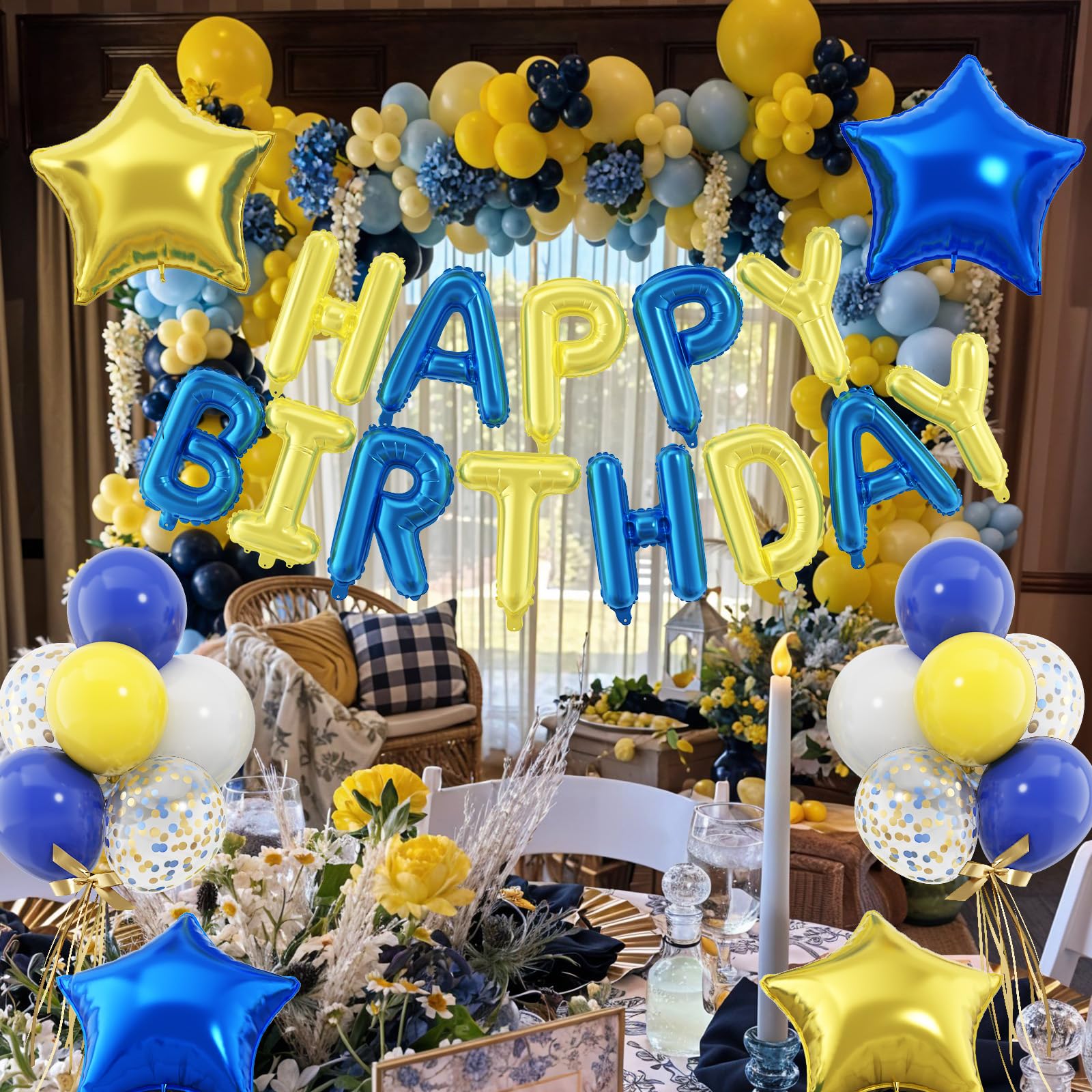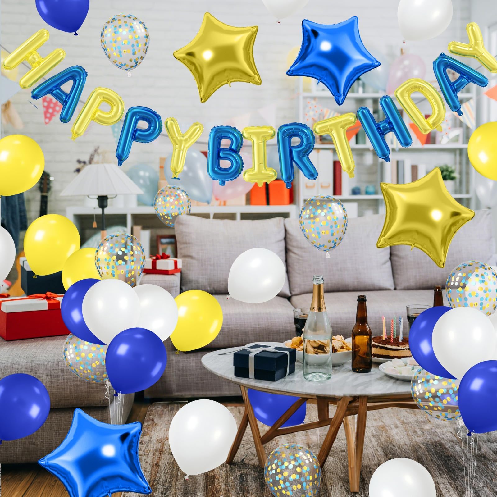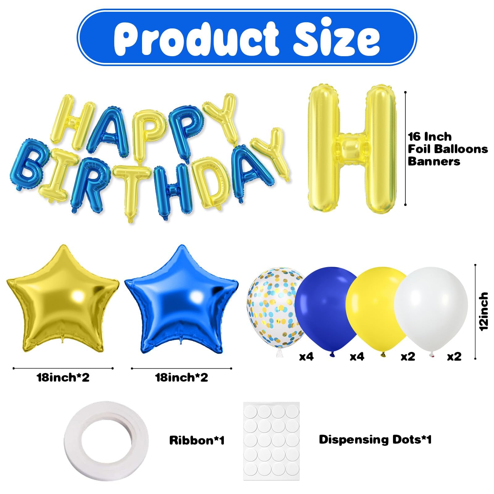 【Package Contains】In Paready Blue Yellow HAPPY BIRTHDAY Balloons set, you'll receive: 1 x 16 inches blue yellow "HAPPY BIRTHDAY" foil balloon banner, 2 x 18 inches blue star foil balloon, 2 x 18 inches yellow star foil balloon, 4 x 12 inches dark blue balloons, 4 x 12 inches yellow、white balloons, 4 x 12 inches blue yellow confetti balloons, 1 roll of 10m white ribbons, 1 balloon dispense, 1 straw for easy inflation.