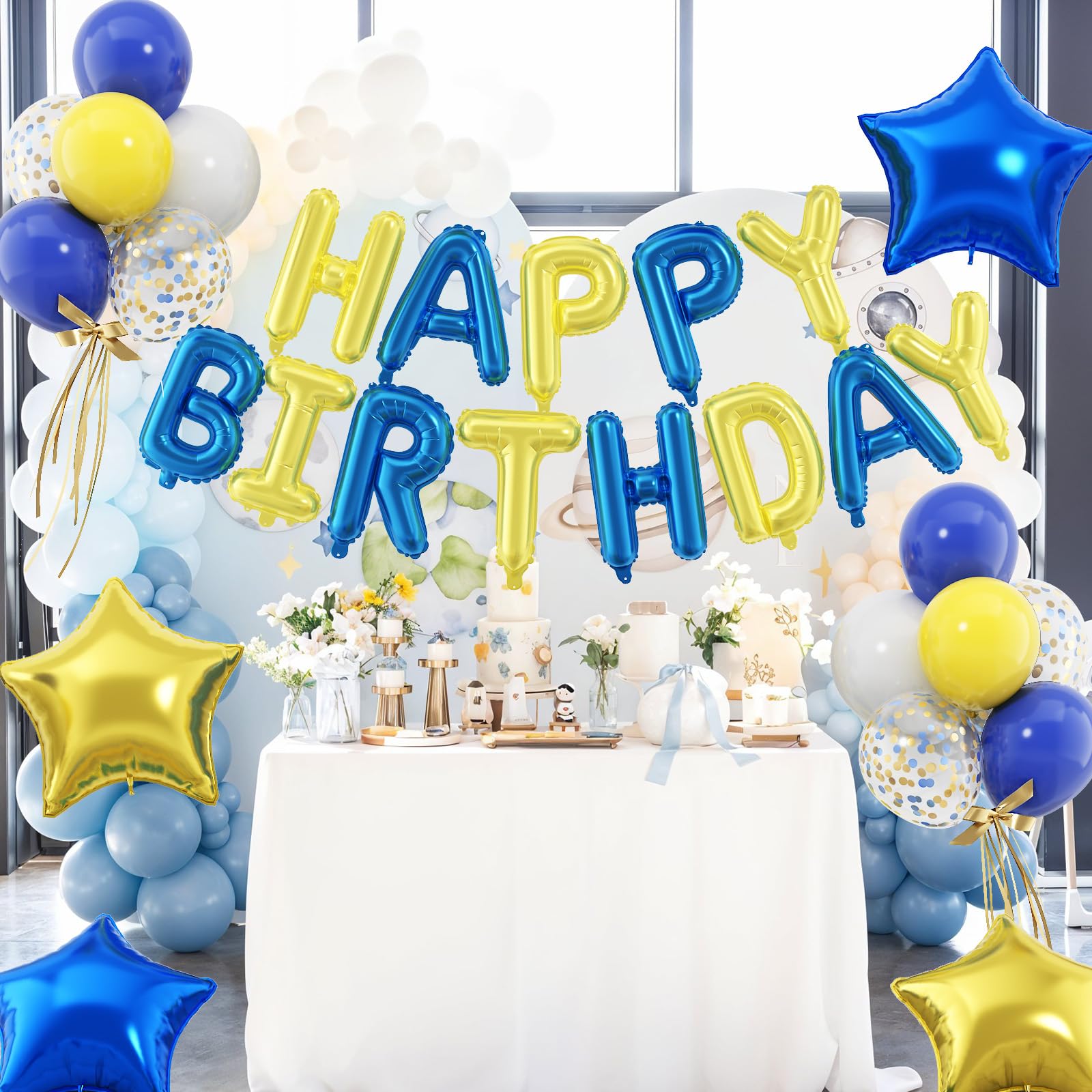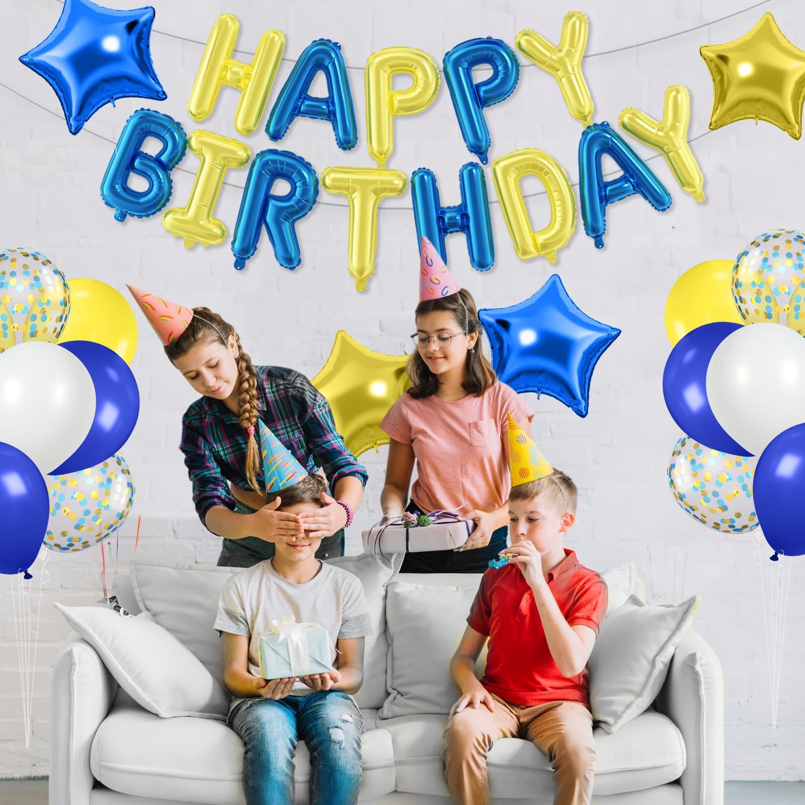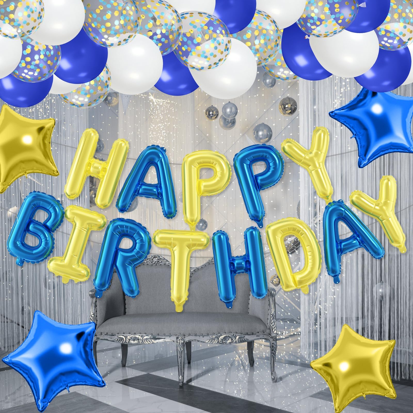 【Package Contains】In Paready Blue Yellow HAPPY BIRTHDAY Balloons set, you'll receive: 1 x 16 inches blue yellow "HAPPY BIRTHDAY" foil balloon banner, 2 x 18 inches blue star foil balloon, 2 x 18 inches yellow star foil balloon, 4 x 12 inches dark blue balloons, 4 x 12 inches yellow、white balloons, 4 x 12 inches blue yellow confetti balloons, 1 roll of 10m white ribbons, 1 balloon dispense, 1 straw for easy inflation.