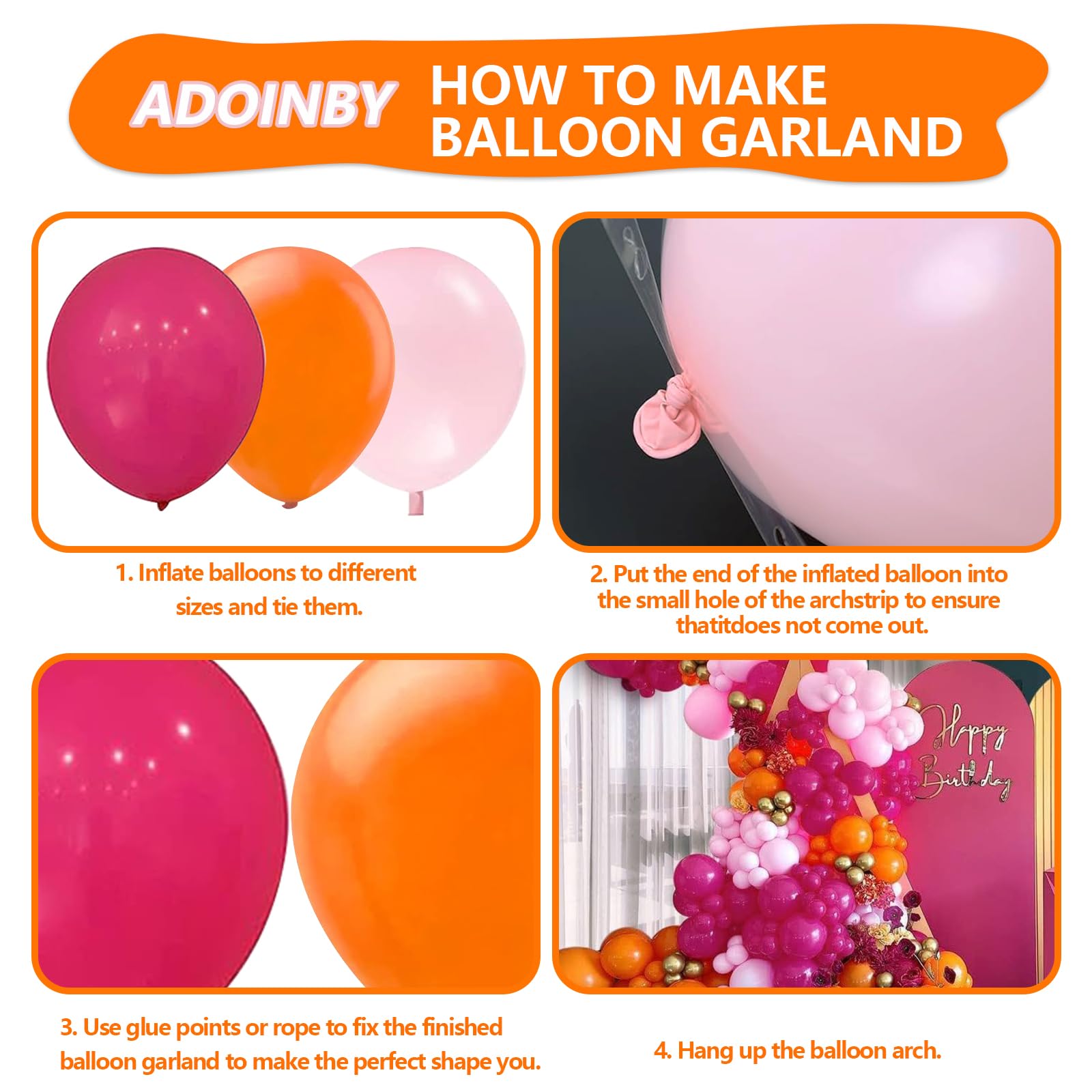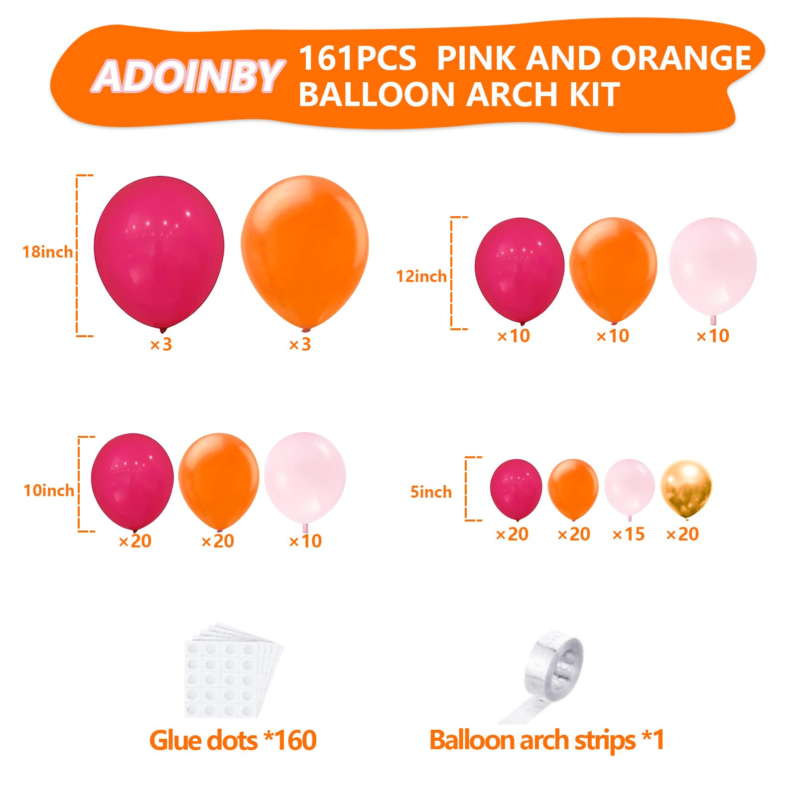 🧡【Pink and Orange Balloon Garland Arch Kit】:Include 18''(Hot Pink balloons 3, Orange balloons 3),12''(Hot Pink balloons 10, Orange balloons 10, Pink Balloons 10), 10''(Hot Pink balloons 20, Orange balloons 20, Pink Balloons 10),5''(Hot Pink balloons 20, Orange balloons 20, Pink Balloons 15, Metallic Gold balloons 20),16FT garland strip x1,160 dots glue.