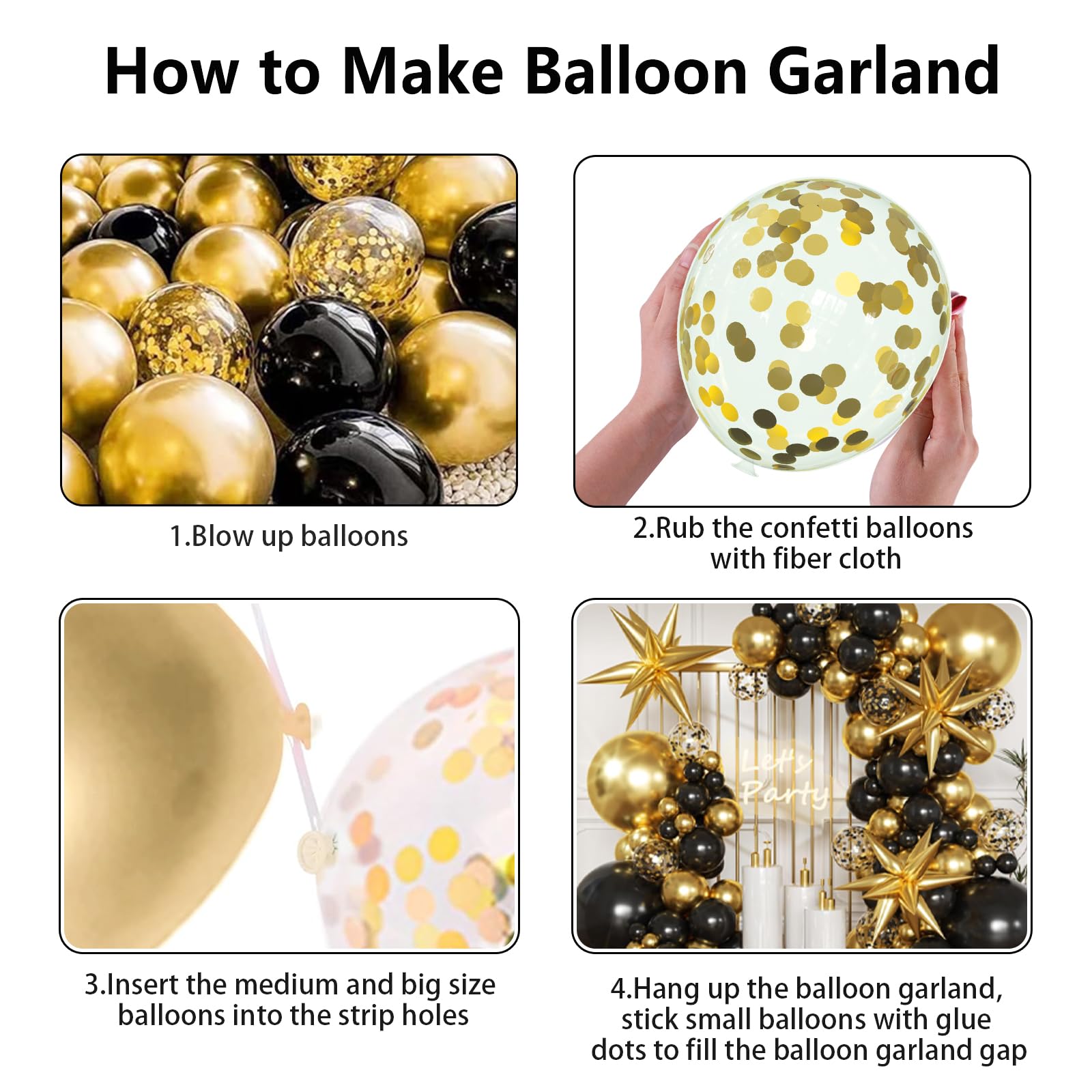 【Easy Assembly】With included three tools - balloon strip, glue dot and ribbon, help you to create a stunning balloon arch easily. First, inflate balloons and insert the balloons into the hole of balloon strip. Second, hang the balloon garland on the window, wall, door or party background with ribbon. Finally, use dot glue and stick 5inch balloons to fill the balloon arch gaps. Warm Note: Rub the gold confetti balloon on a dry towel or carpet to create static, allowing the confetti to evenly distribute.