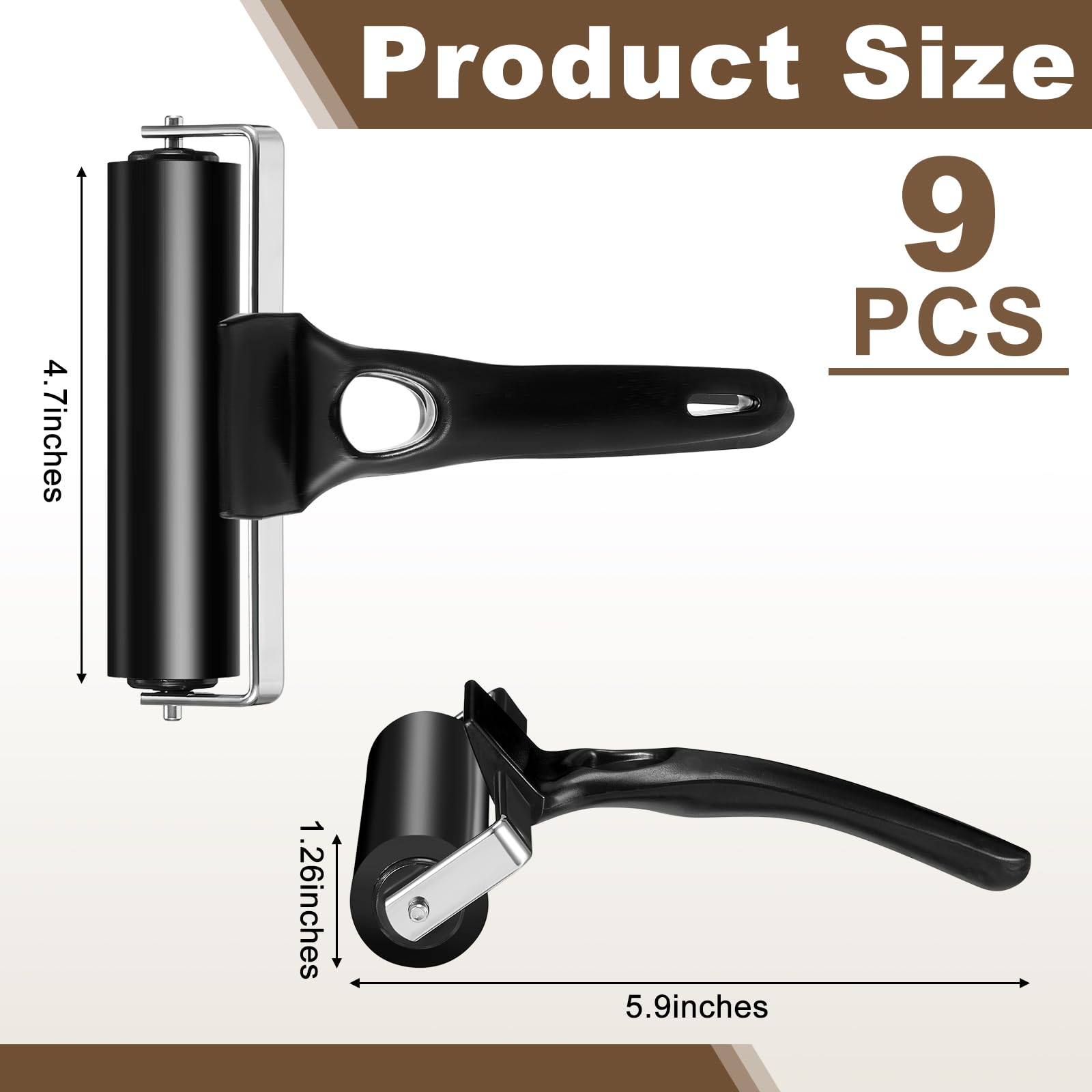 Features: This ink roller is practical, it can be applied to gluing, printing, inking, paper crafting, press engraving surfaces, stamping tools, and construction. The rubber brayer has a smooth surface, providing a fluent rolling and the plastic handle ensures the nonslip and easy holding, bringing a nice using experience Specifications: Main material: rubber Color: black Size: Width of rollers: approx. 4.7 inches/ 12 cm Diameter of rollers: approx. 1.26 inches/ 3.2 cm Total length with handles: approx. 5.9 inches/ 15.2 cm Package includes: 9 x Rubber brayer rollers Notes: Manual measurement, please allow slight errors on size. The color may exist a slight difference due to different screen displays