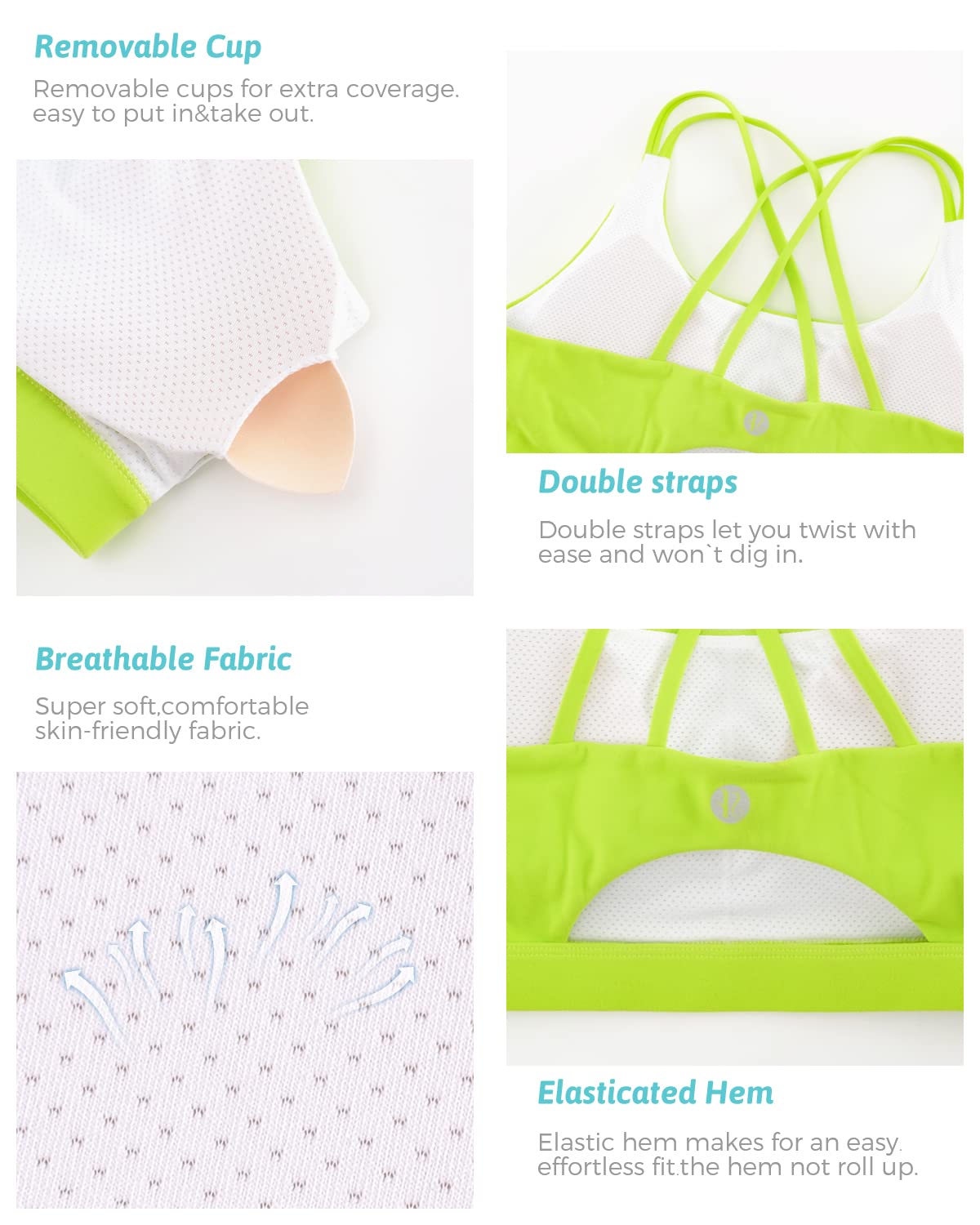 √YOUR SECURE FIT - Strappy design meets sporty style. Super soft scoop neckline with light, removable pads. Open cutout back styling sports bras for women medium support, widen band underneath the breast ensures a tight secure fit. Removable cups for extra coverage. The removable vertical cotton bra pads are easy to clean.The padded sports bra which always retains its shape and prevent bra bulges, caresses your figure to adjust to your curves.