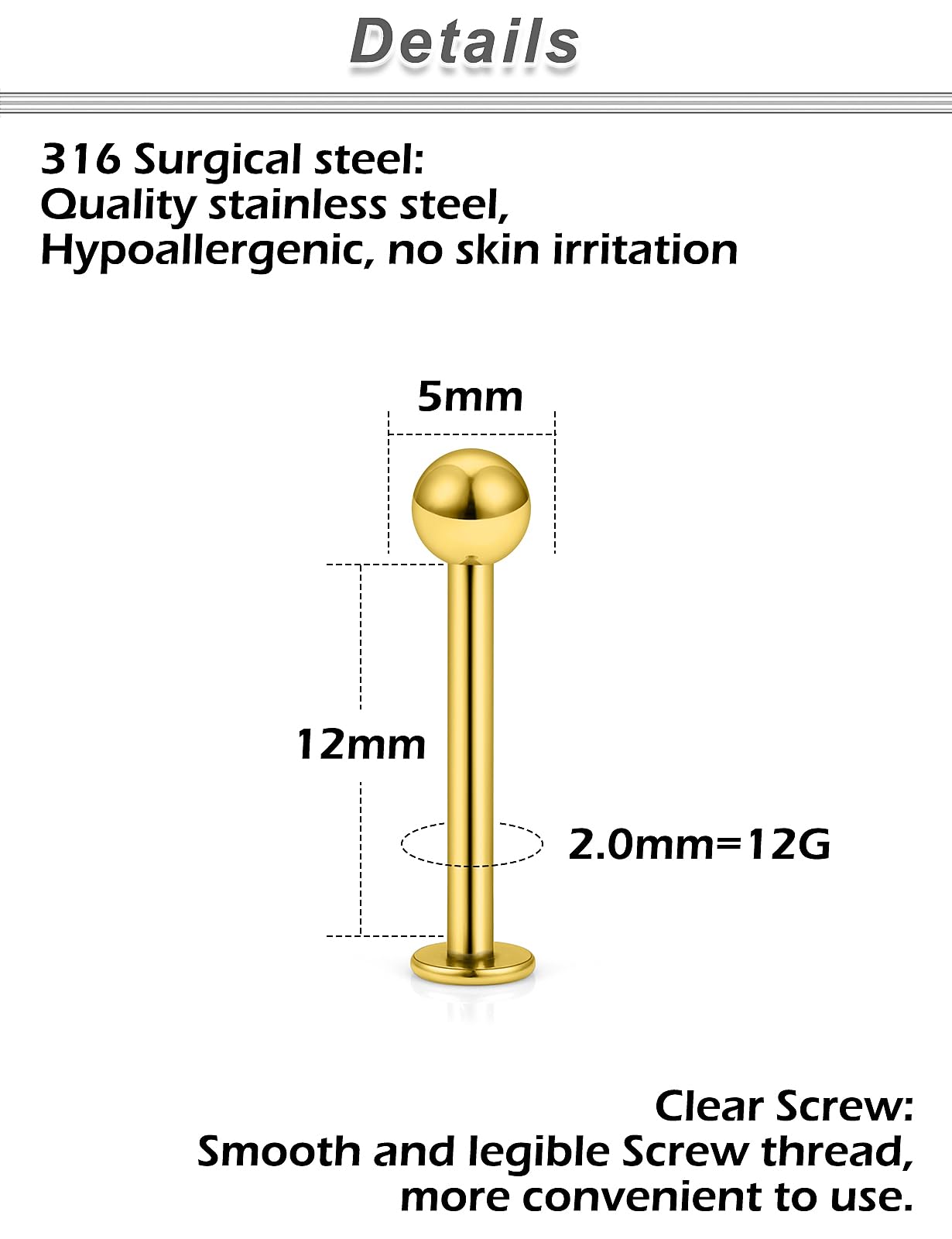 MEASUREMENTS--Lip Rings Studs Gauge Size: 12G (2.0mm); Straight Bar Length: 12mm(1/2 Inch),Top Size:5mm, The Different Sizes Made It Easy to Find the Right One for You. Color: Gold-tone.