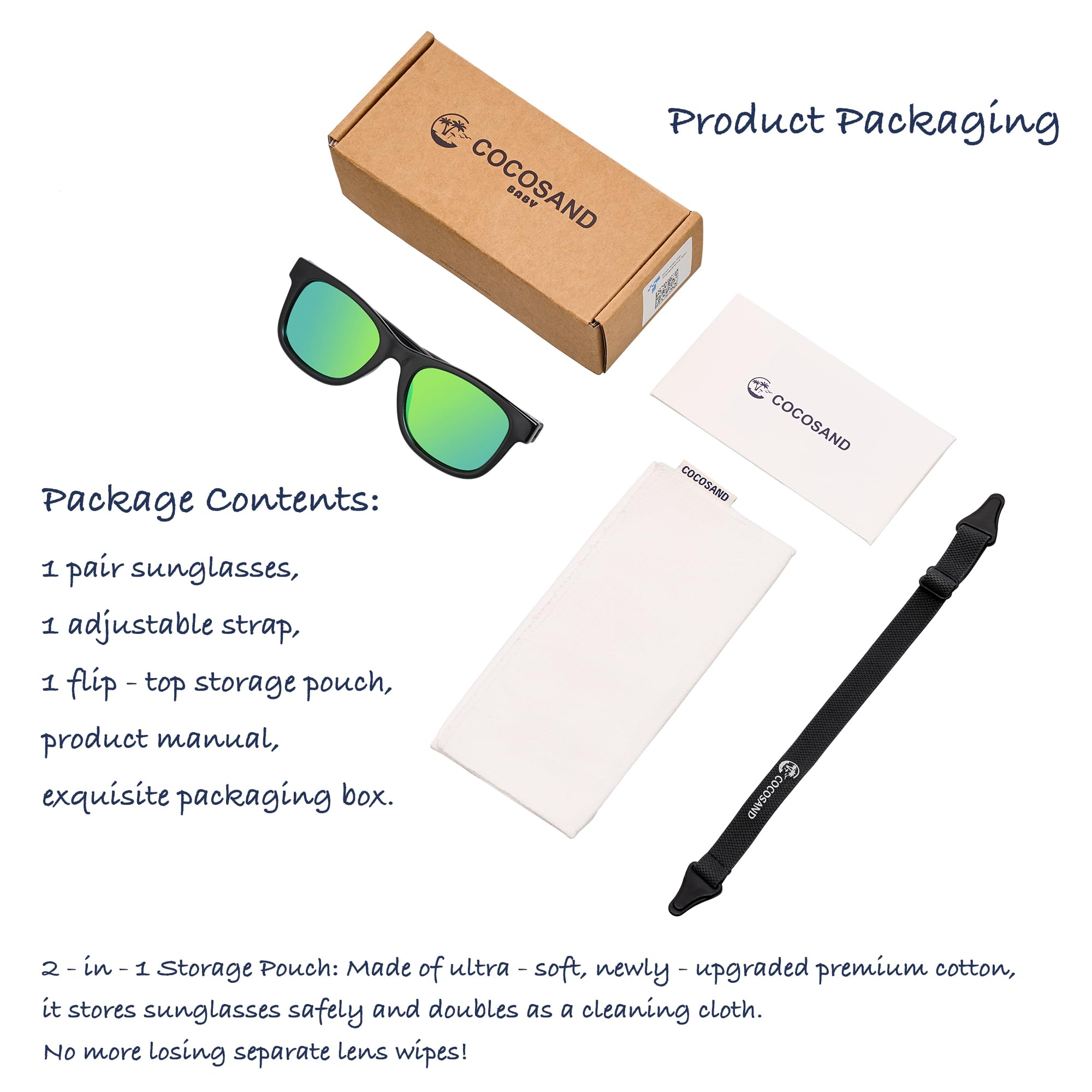 【Stylish and Practical Package】:COCOSAND baby sunglasses come with a flip - top glasses pouch and a product manual. The packaging is made of kraft paper, simple yet elegant
