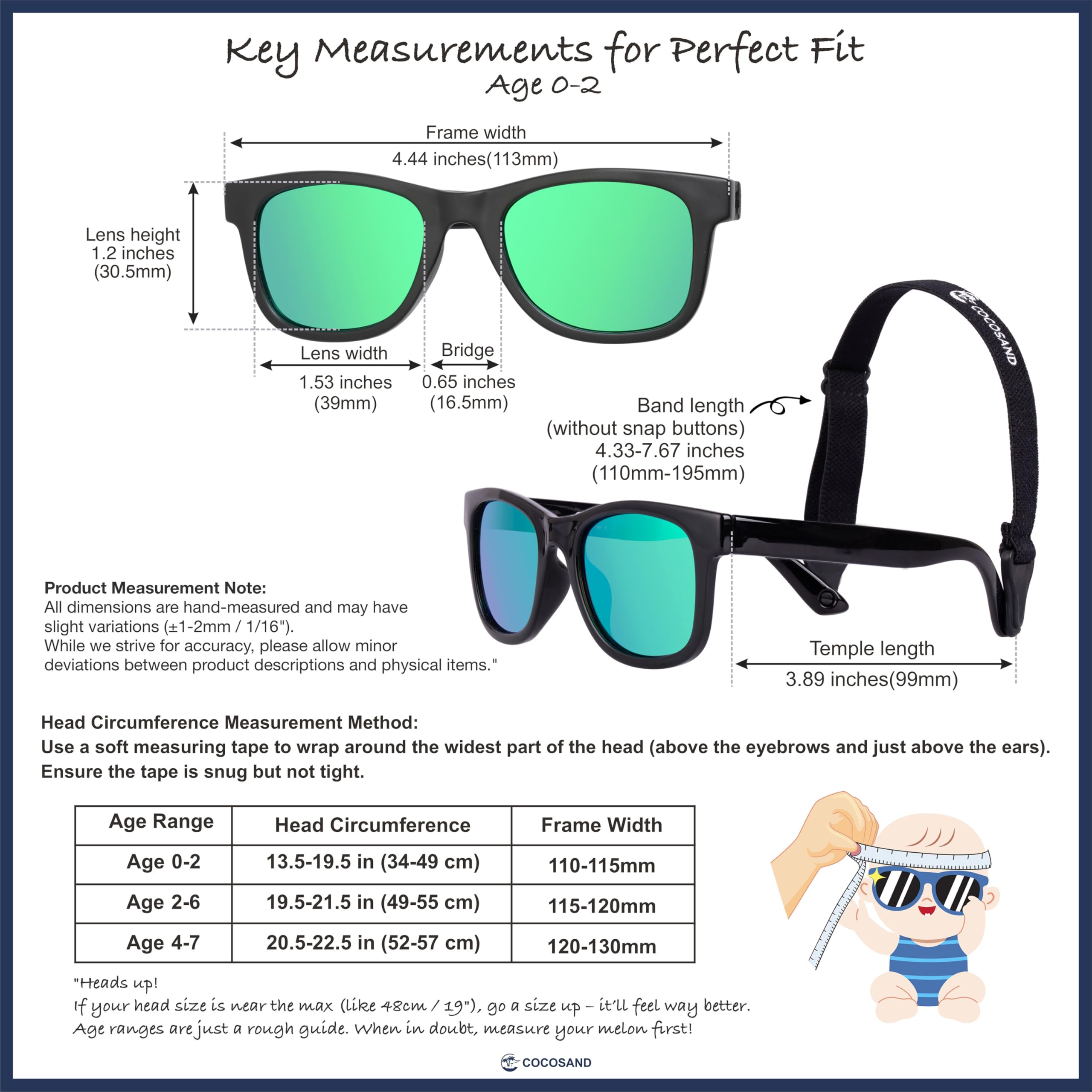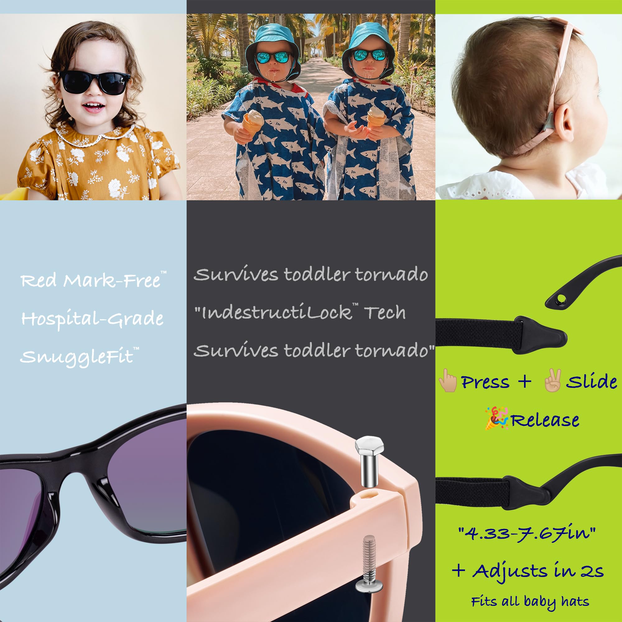 【Perfect Fit for Growing Babies】:Our infant sunglasses fit babies with head circumferences up to 48cm. The adjustable temple and 110-195mm strap mean a custom fit for every stage. Whether your baby boy or baby girl is growing fast, these sunglasses grow with them