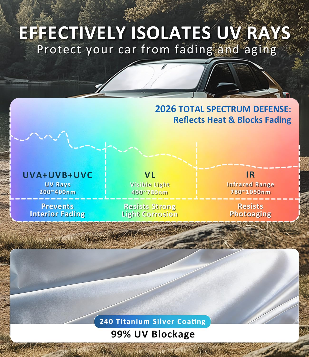 [Stay Cool and Reflect Sun] Crafted from high-density 240T polyester and a blackout coating, this windshield sun shade effectively reflects 99% of UV rays and sunlight to block heat while your car is parked; It shields your interior from intense heat, helping to prevent damage and maintain a more stable temperature.