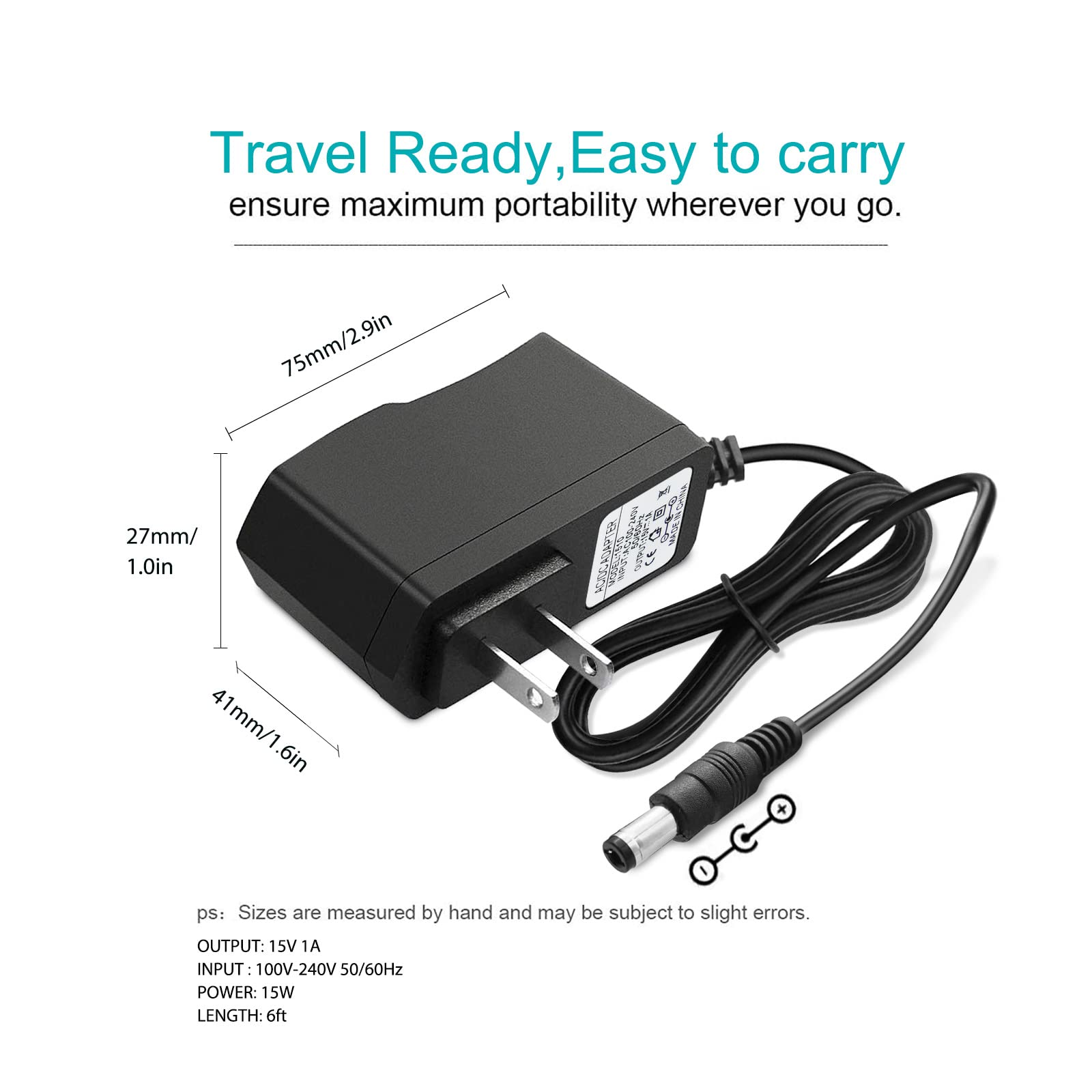 Product Feature: Durable, Long Service Life. Safe and Fast Charging Your Equipment. Brand New Input:100-240V,2A 50-60Hz DC Output: 15V 1A DC Plug Polarity: inner Positive(+), outer Negative(-). DC Cable Length: about 6.6Ft/200CM DC Plug Size: 5.5x2.5mm tip (inside"+", outside"-"), 6 Adapter Plugs Size: A: 6.0*4.4mm with pin inside. B: 6.3*3.0mm. F: 4.8*1.7mm. G: 4.0*1.7mm. H: 3.5*1.35mm. X: 2.5*0.7mm. Working Temperature: 0~40℃ Ambient Humidity: 0~95% Non-Condensation Package: 1 x 15V 1A Universal power adapter 8 x DC adapter Plugs If There's any Quality Question of Our Items, Please Contact Us and We Will Reply You Back within 24H. Compatible With Following Models: Jump-N-Carry models JNC311 and JNC318,JNC311 12V Jump Starter Clore Automotive N-Carry JNC318 12V Jump Starter BASAF Car Jump Starter 600A Peak Car Jump Starter Battery Booster(JX10) Suaoki U10 800A U28 2000A Peak Jump Starter Pack Portable Auto Battery Booster(U10,U28 175000002-04,213505101-01) ETABLE Car Jump Starter 600A Peak Car Jump Starter (E1227) AUDEW 400A Peak Car Jump Starter (AUDEWChslycxc1520),(PB-C7-Y) HALF Minute Power 600A Peak Car Jump Starter (JP06LP-A01) 500A 600A Peak Car Jump Starter (D25, D35) URBANIX 600A Peak Car Jump Starter (UX-49) Vetomile 800A Peak Car Jump Starter (ca-jp-01) DBPOWER 500A Peak Car Jump Starter (DJS60-2),1200A Peak Car Jump Starter (N01) GOOLOO 450A Peak Car Jump Starter (E-POWER 03,GP03B),1000A Peak Car Jump Starter(GP200) Rugged Geek RG500, RG600 and RG1000 Peak Jump Starter (RG500,RG600 and IBU_RG1000) 600A Peak Car Jump Starter (JB11R-AB) Anker PowerCore 400A 800A Peak Car Jump Starter(AK-A1501011, AK-A1502111) BEATIT TECH 600A 88A Peak Car Jump Starter (BT-9,B9,BT-D11)