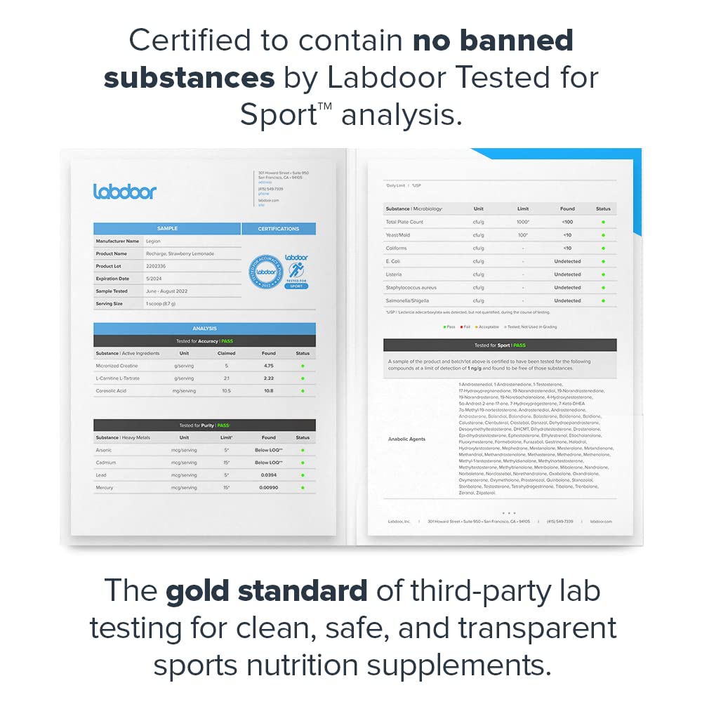 Tested for purity and potency in an ISO 17025 accredited third-party lab, and independently certified to contain no contaminants or banned substances by Labdoor. Every bottle of our Recharge workout supplement for men and women is guaranteed to provide exactly what the label claims and nothing else.
