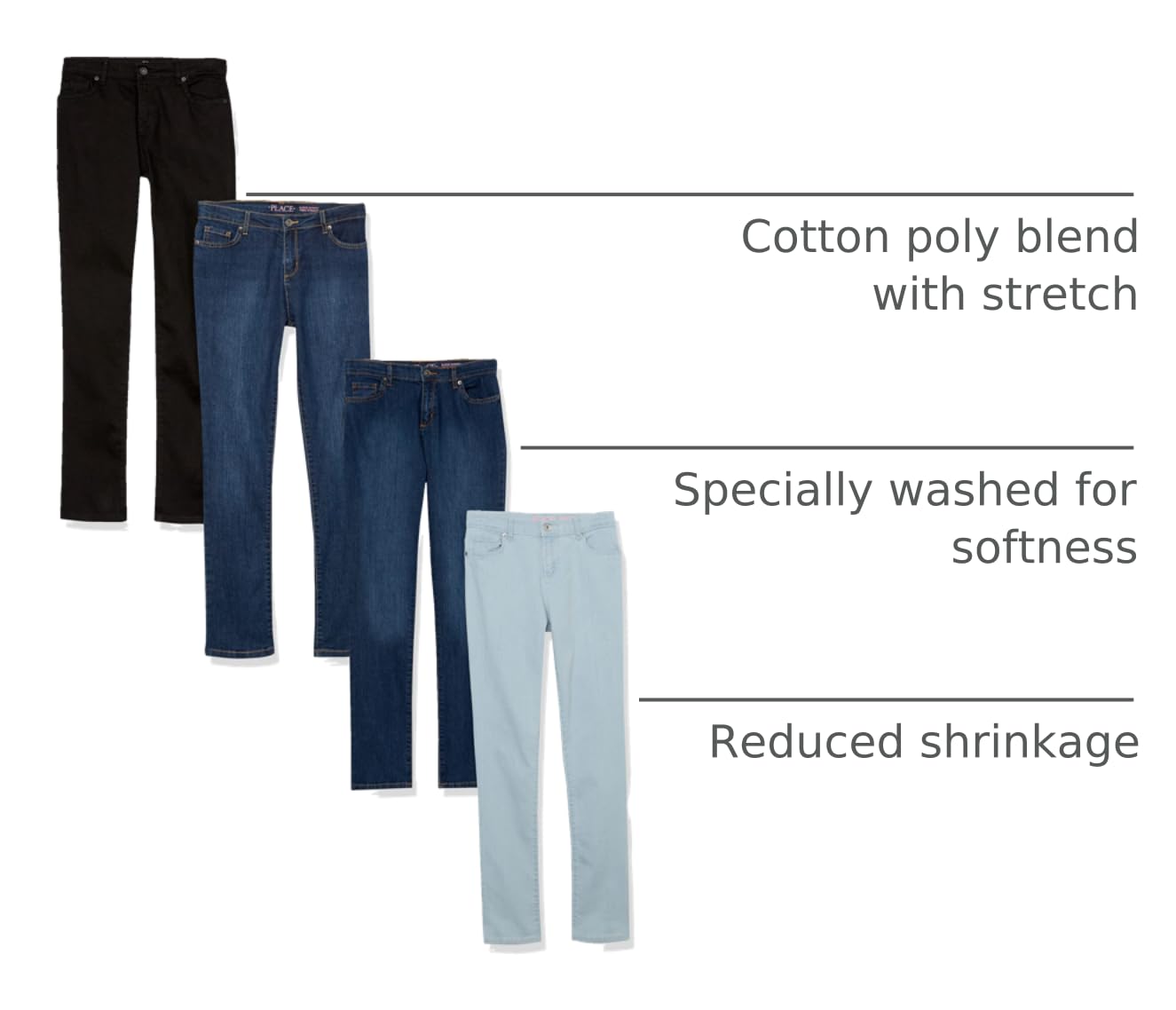 Sleek fitted silhouettes with 5-pocket styling and inner adjustable waist tabs; snap closure with zipper fly for sizes 4-6X/7 and button closure with zipper fly for sizes 8-16