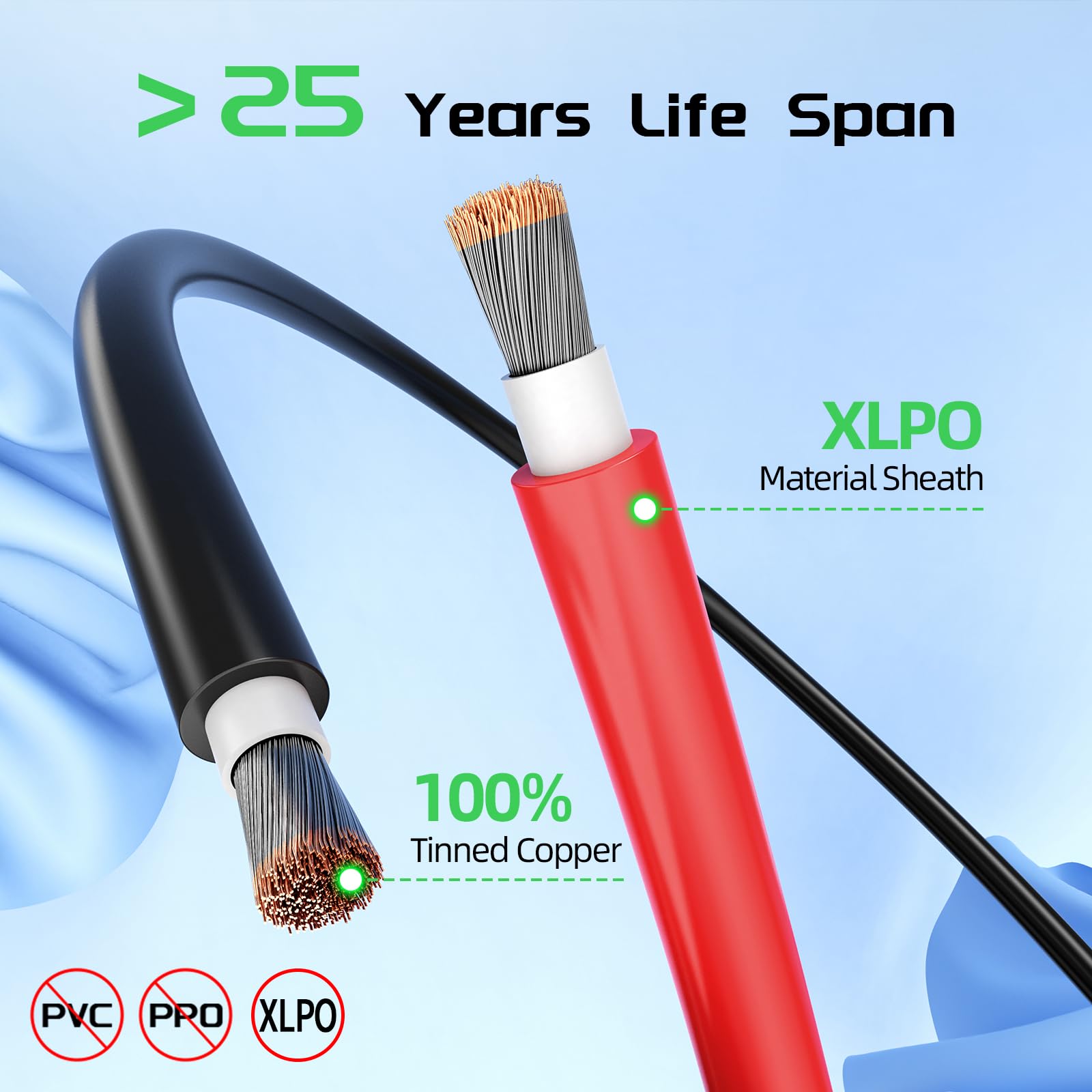 Industrial-Grade 25-Year Solar Cable: The solar panel cable is made of 100% tin-plated copper wire, which meets rigorous TÜV/BUILDING WIRE standards: ✓ 0.0015Ω ultra-low impedance per foot; ✓ 1500V/482°F continuous operation rating; ✓ Dual-layer irradiation cross-linked armor (XLPO protective jacket); ✓ IEC 60332-1 certified flame retardancy