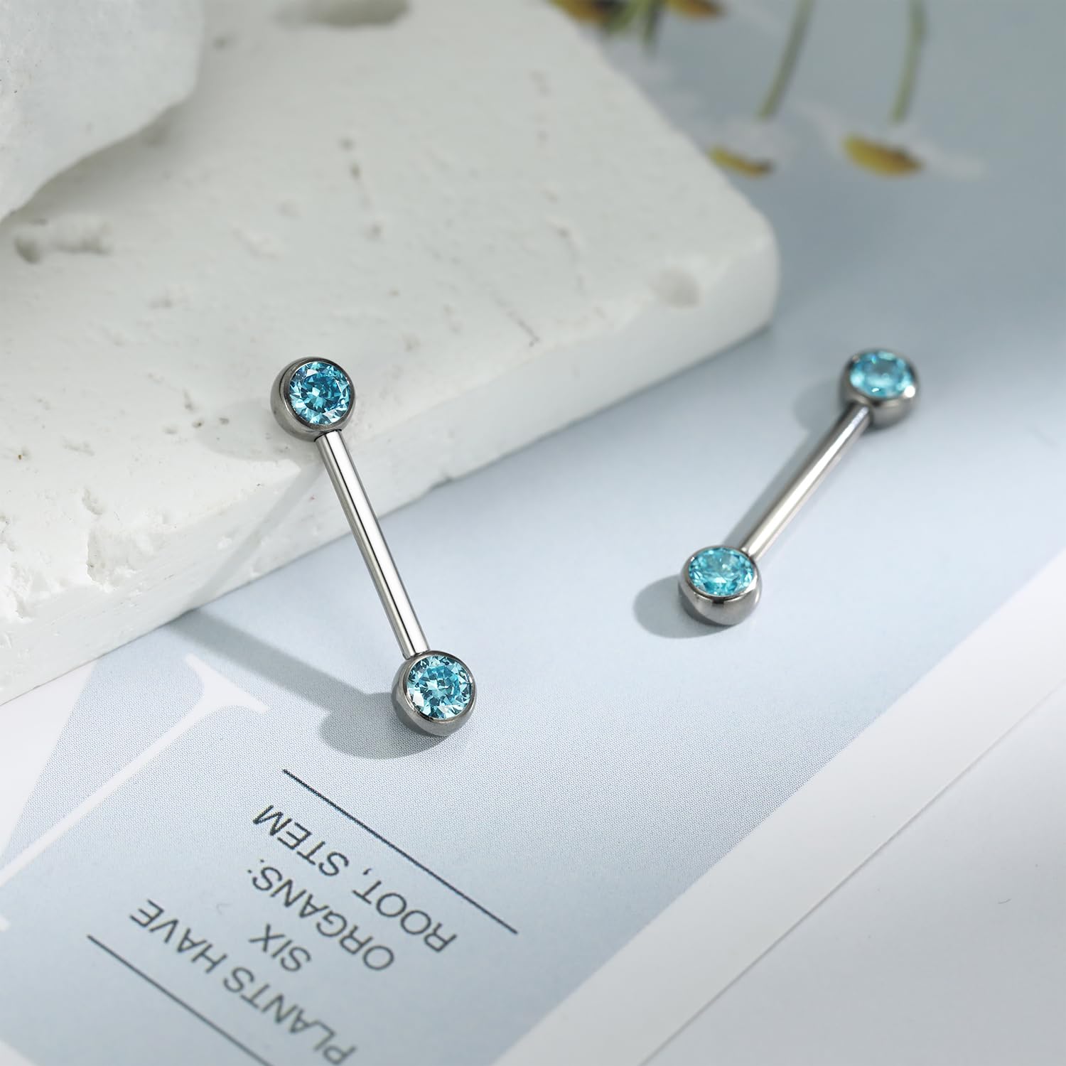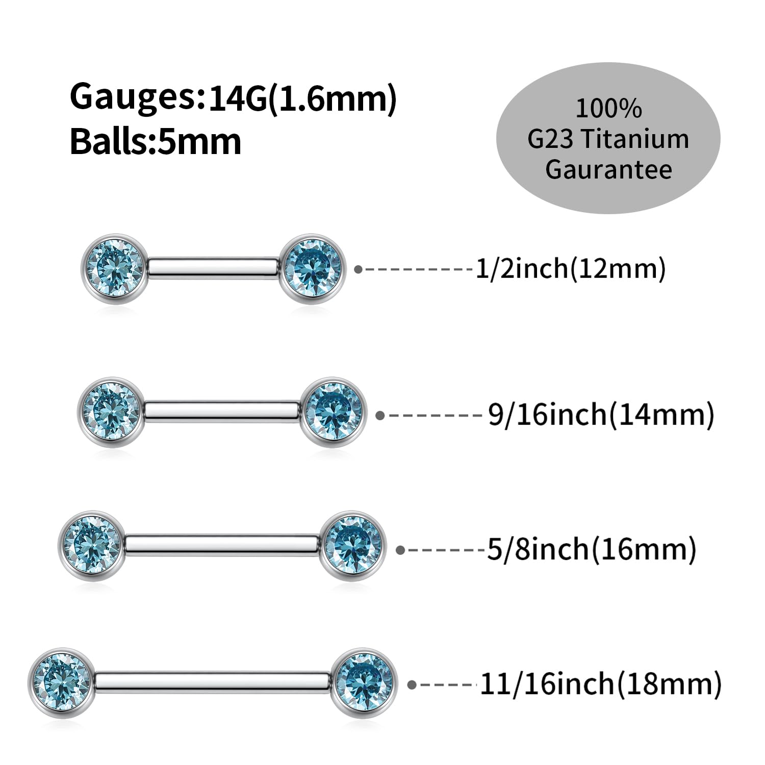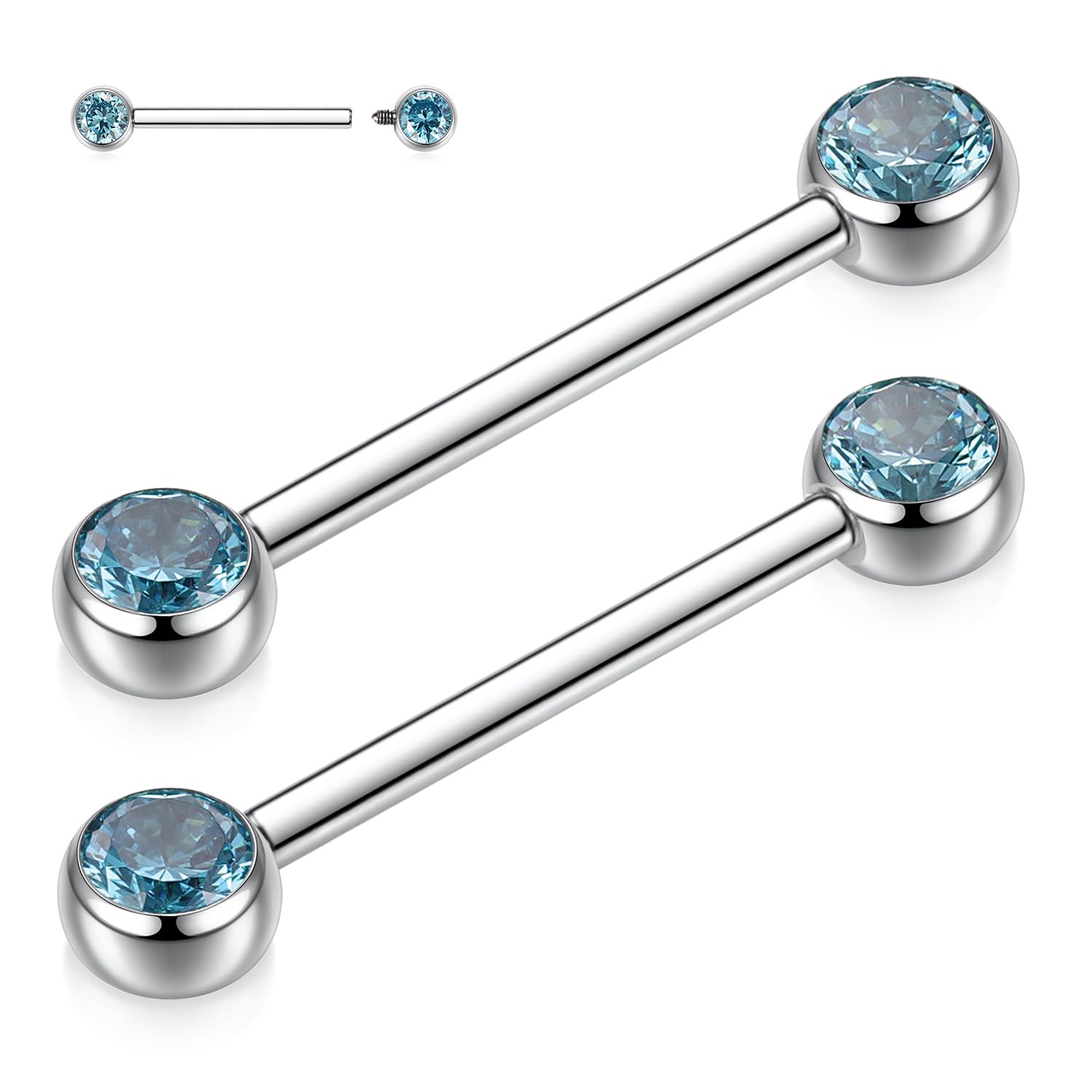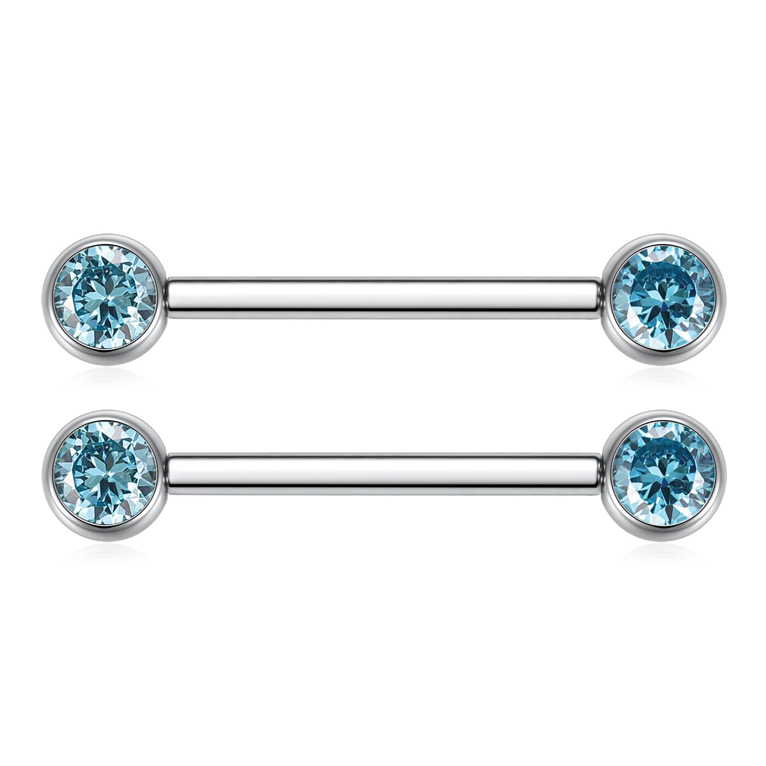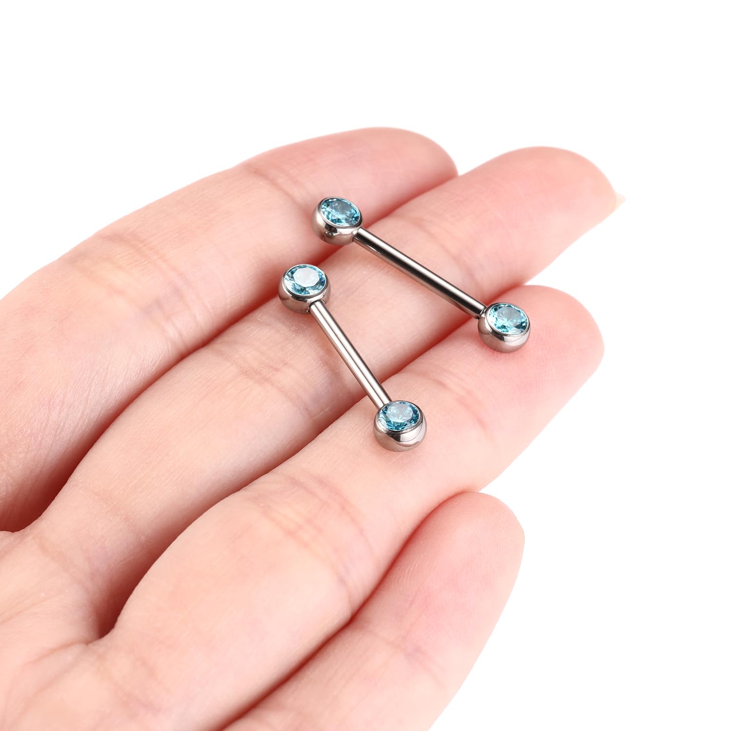 Size and Color: Gauge: 14 G (1.6 mm); Nipple Barbell Length: 1/2"(12 mm); CZ Size: 5 mm. Color:Silver with Blue CZ.1 pair nipple ring per order