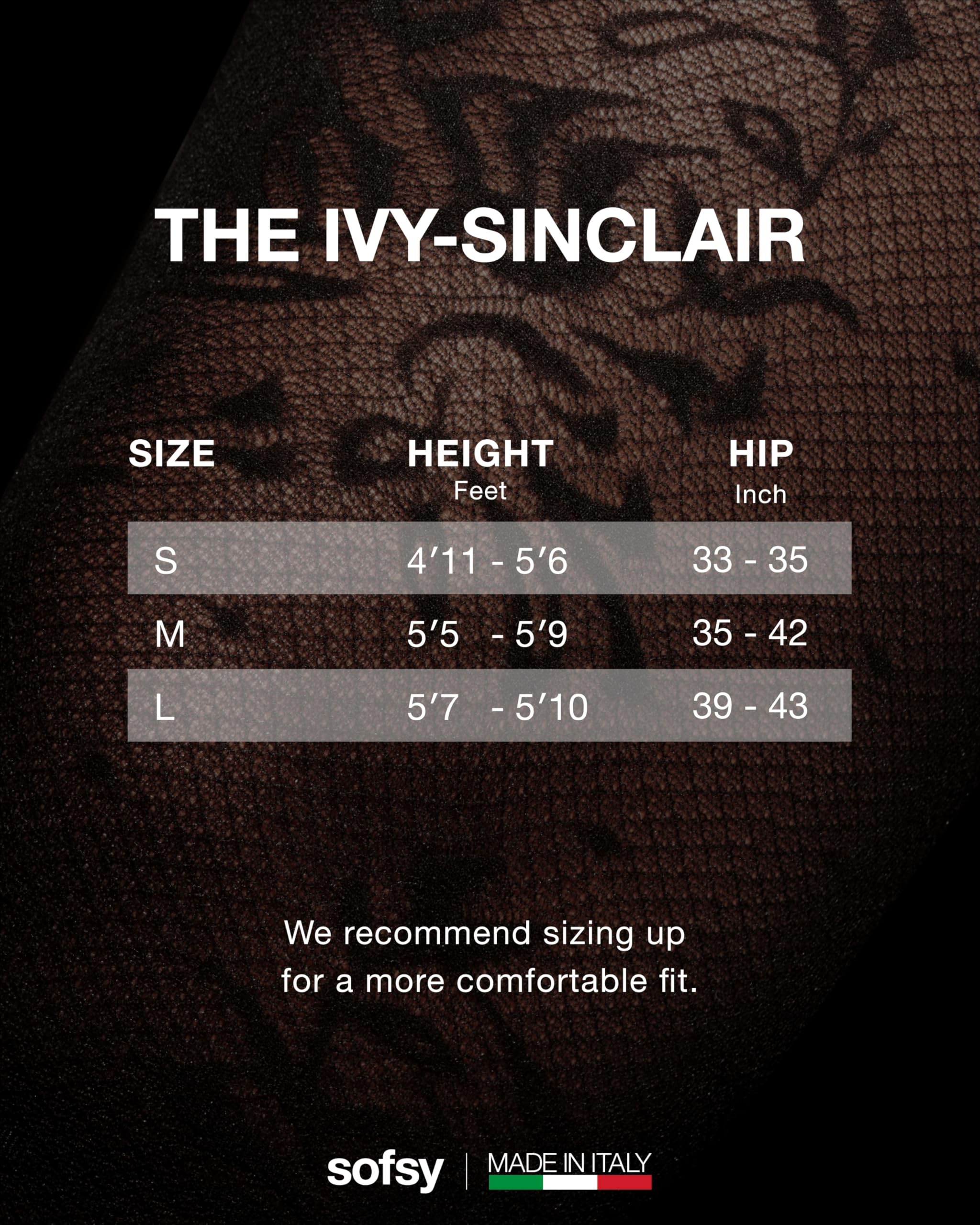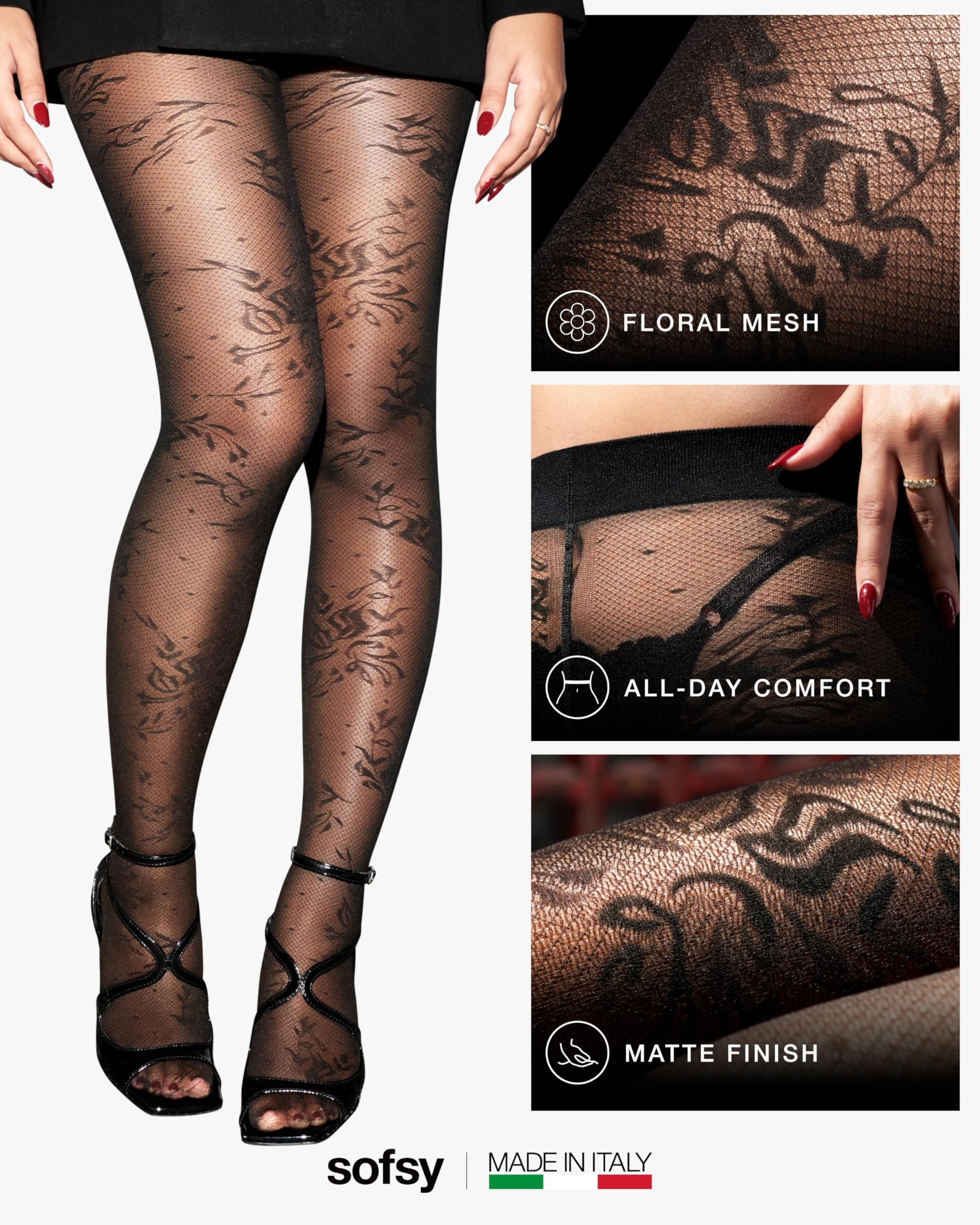 Description Elevate your style with sofsy’s Italian-Made Patterned Tights — where timeless elegance meets everyday versatility, backed by customer-loved comfort and lasting quality. Designed for women who value both beauty and function, our collection includes lace tights, floral tights, diamond patterned tights, and patterned fishnet stockings for women, each crafted in Italy with over a decade of hosiery expertise. Every pair is made from premium, OEKO-TEX certified nylon–elastane blends for a buttery-soft, breathable feel and true-to-size fit that stretches comfortably without digging or rolling. The all-day stay-up high waistband smooths and flatters, while reinforced toes and quality knitting deliver durable, rip-resistant wear that holds up through dancing, layering, and everyday movement. Choose from delicate floral lace tights, bold fishnet patterns, chic diamond designs, or opaque tights with designs — each one finished with intricate patterns exactly as pictured. Whether it’s lace stockings for women sexy enough for date nights, rose tights for a romantic touch, or black tights with designs for sophisticated workwear, sofsy patterned tights adapt seamlessly to every wardrobe moment. Perfect for office wear, party outfits, costumes, and casual styling, these tights pair effortlessly with dresses, skirts, or shorts. With luxurious Italian craftsmanship, inclusive sizing from XS to Large, and versatile patterns, they’re more than an accessory — they’re a style investment you’ll reach for season after season.