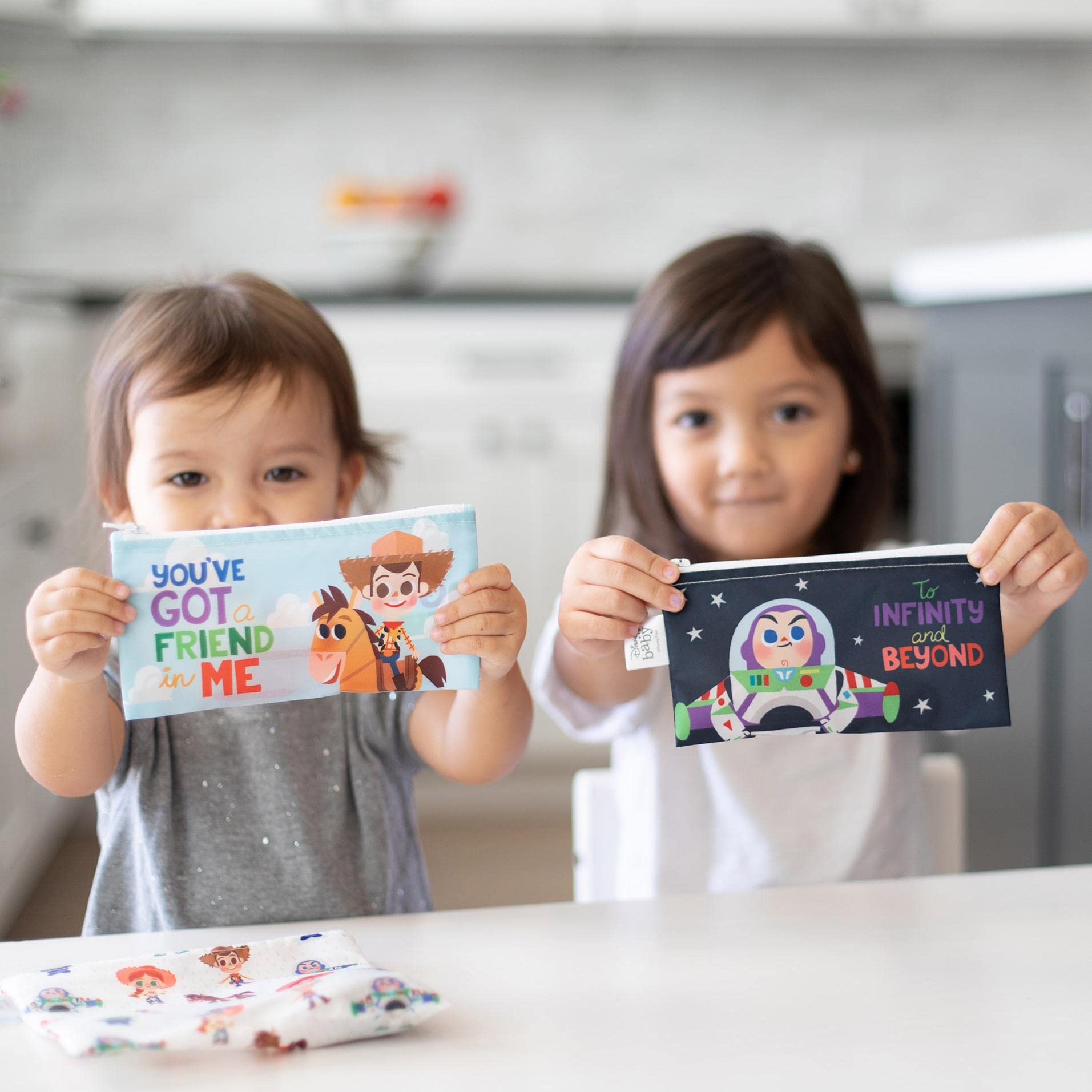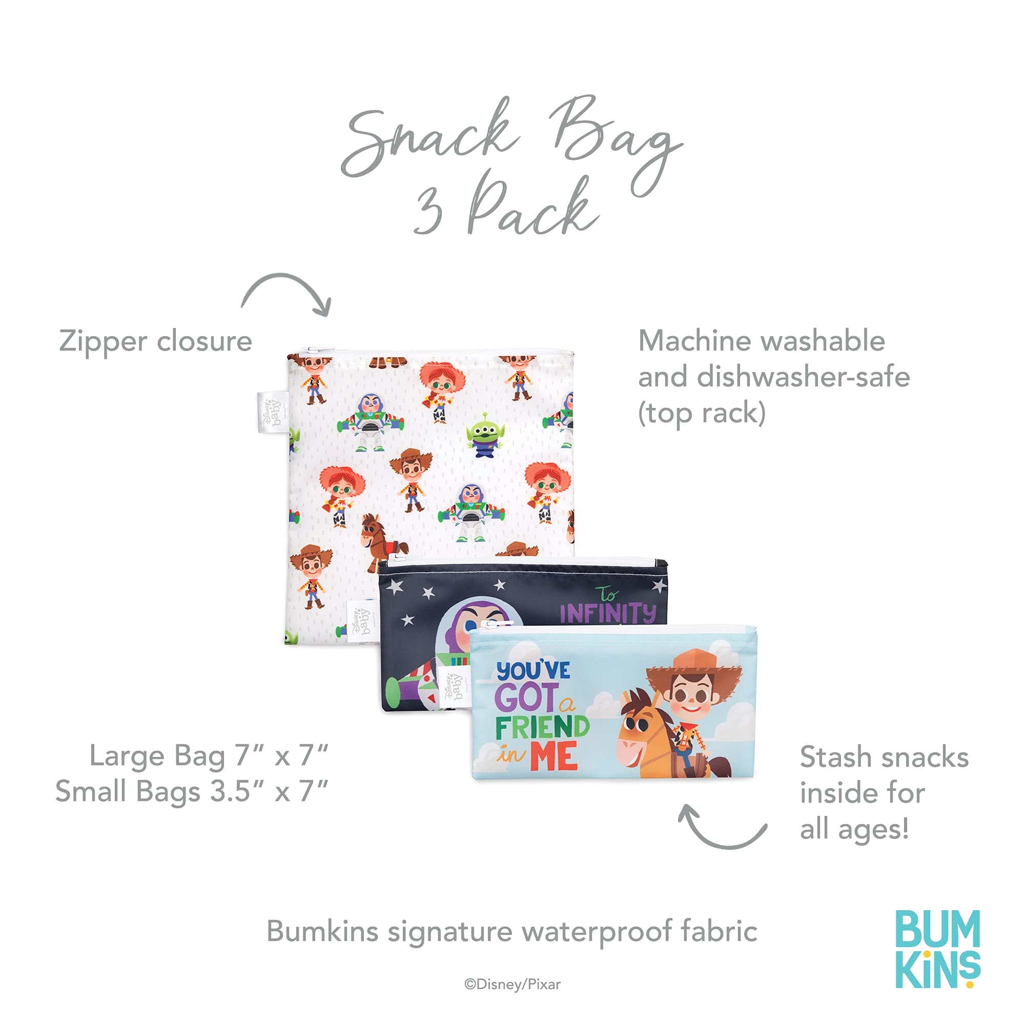 Featuring Woody, Buzz Lightyear, and a variety of other toys from the toy box. The better alternative to single-use plastic bags, our reusable sandwich and snack bags are made from Bumkins’ original easy-wipe waterproof fabric. Reusable cloth bags help reduce waste from plastic bags and takeout containers. By packing lunches and snacks, you can stay on budget, ensure foods are allergy-free and adhere to dietary restrictions, plan healthier options. Plus, you’ll have something on hand when you’re hungry! Not just for food—snack bags make excellent organizers for storage and travel! Stash inside a lunch bag, purse, diaper bag, or travel bag. Great for lunches; zip away toys, electronics and more. Our reusable bags have a strong and durable zipper closure that keeps in crumbs, and the single-ply fabric means no worrying about icky stuff growing between layers of extra material. Made from Bumkins’ original fabric that’s 100-percent polyester with embedded TPU for water resistance. Bags are lightweight and lay flat, so when traveling they take up less space when empty than other containers and bags. Machine washable and dishwasher-safe (top rack) for easy cleaning. This set of three includes one large and two small bags. Large measures approximately 7in x 7in; Small measures approximately 3.5in x 7in. We use third party labs to ensure the products we manufacture comply with CPSC and CPSIA standards for BPA, Lead, and Phthalates. Tested for Small Parts according to 16 CFR 1500.50 – Results: No small parts. For over 30 years, Bumkins has been creating thoughtful and responsibly made essentials for babies and kids, making parenting easier so families can cherish those special moments. Designed in Arizona, responsibly made in China.
