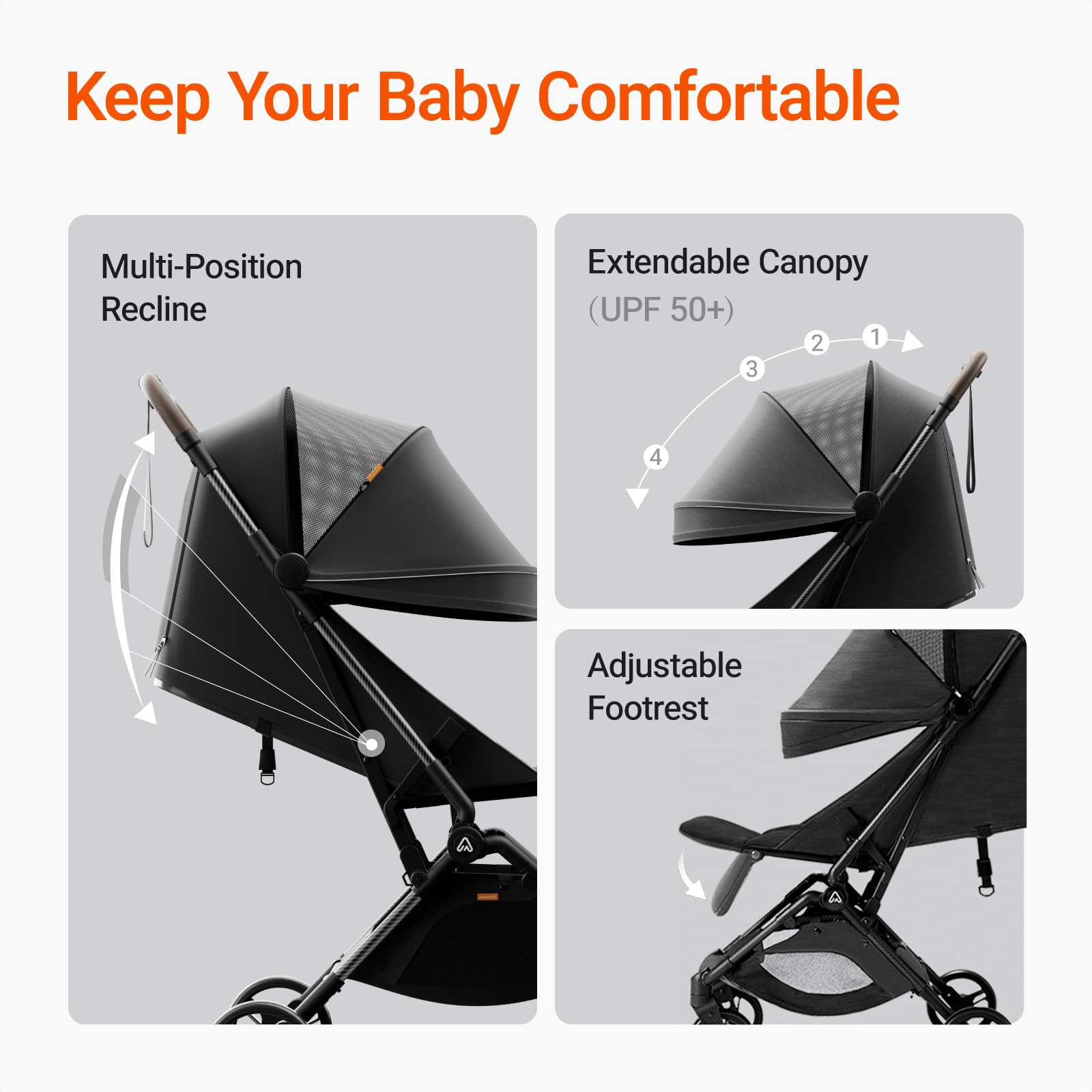 Sun Protection and Comfort: Your child's comfort and safety are our top priorities. The Ultra Air Stroller features a UV-protective canopy that shields your little one from harmful sun rays, providing a cool and shaded haven for them to relax in. The adjustable UPF 50+ canopy can be easily positioned to cater to different sun angles, allowing you to create the perfect shady spot as you explore outdoor locales.