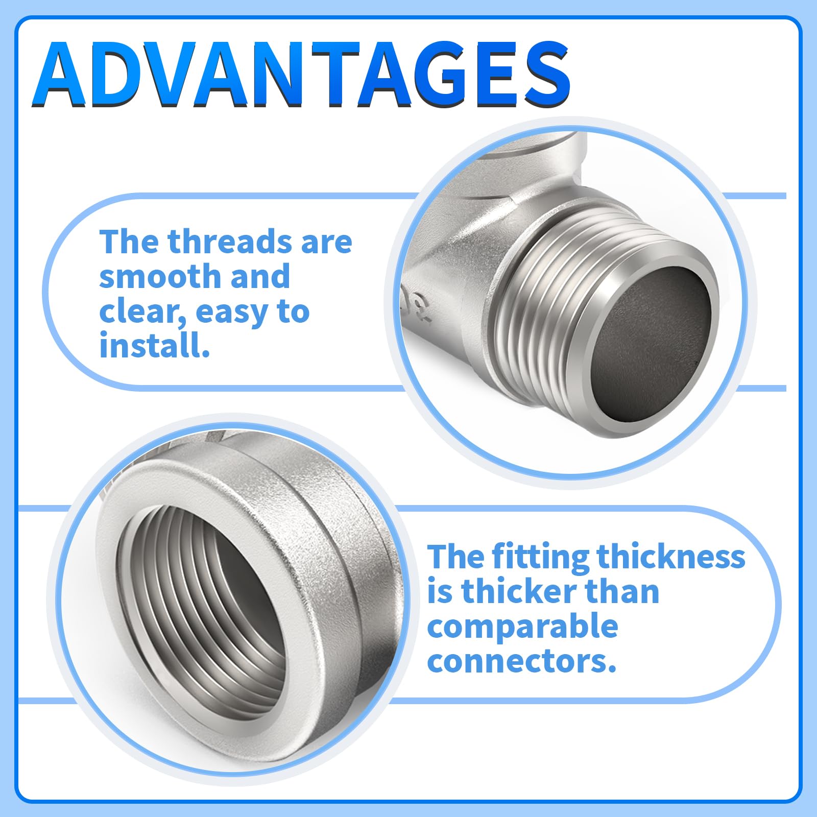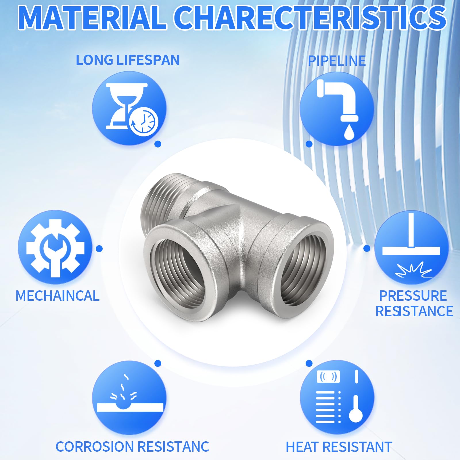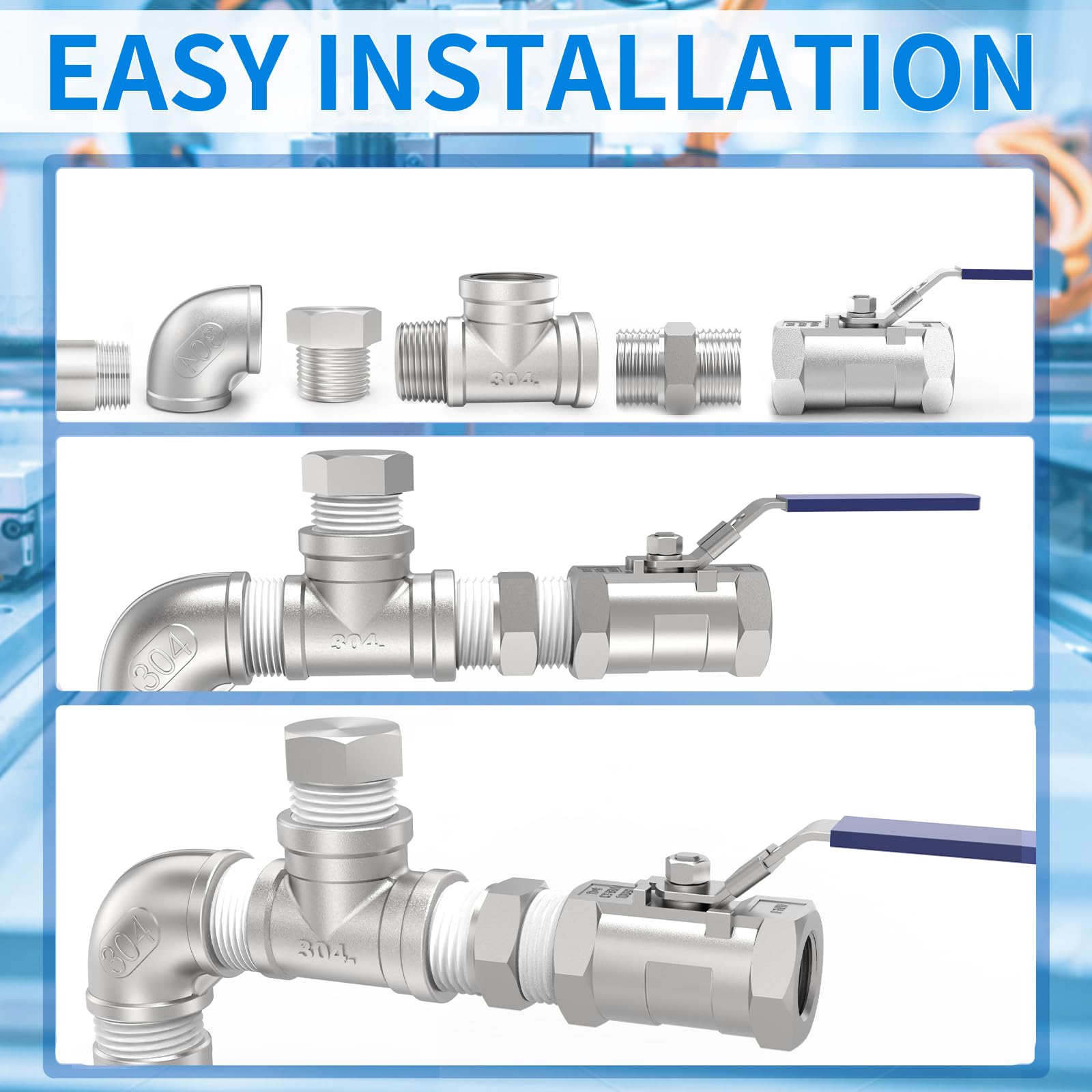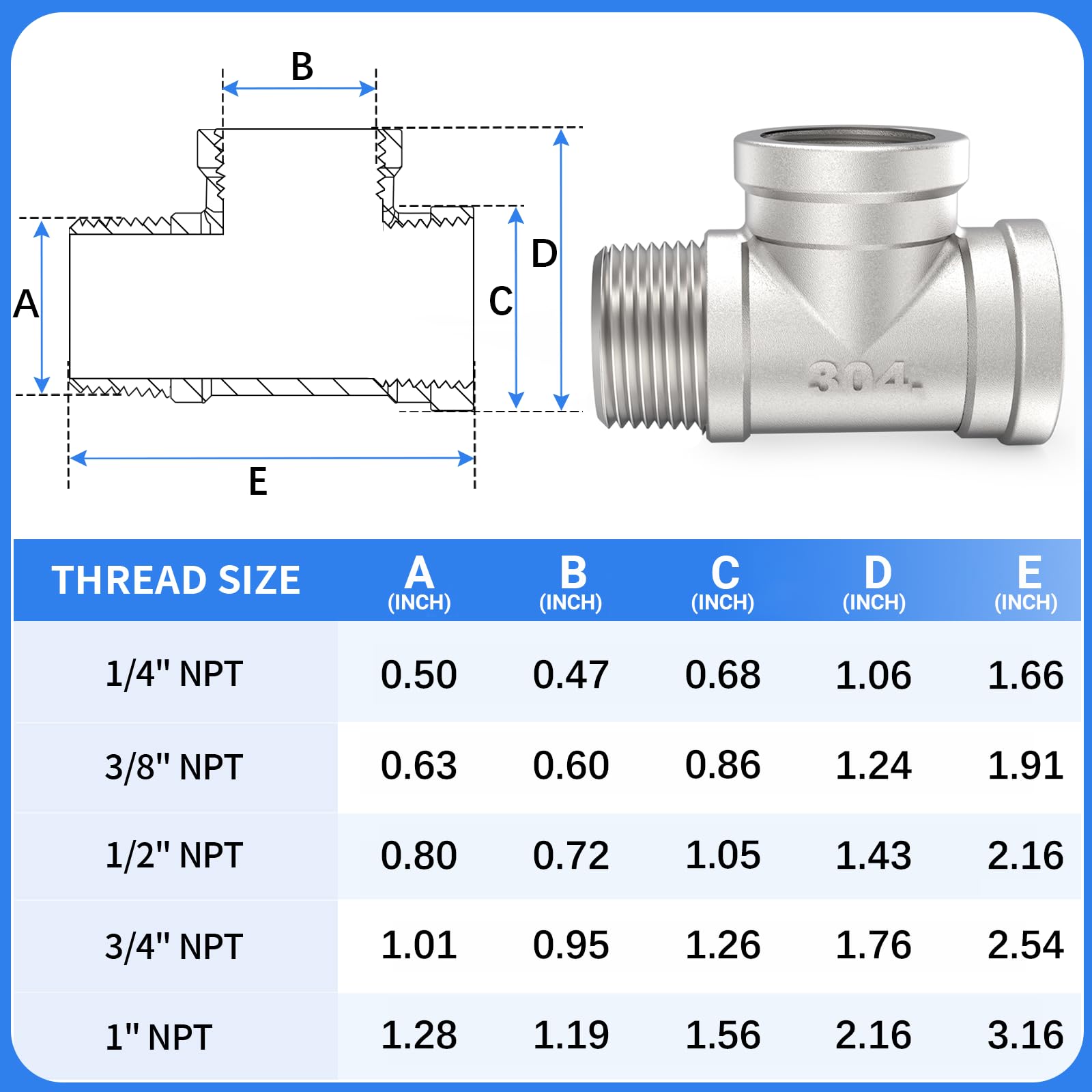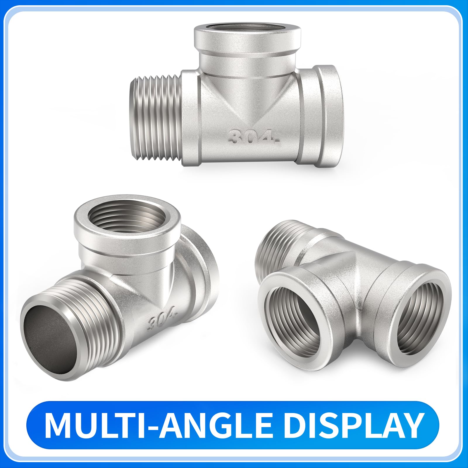Pipe fittings are the components in the pipeline system that play the roles of connection, control, reversal, diversion, sealing, and support. Note that the 304 Stainless Steel Tee are US NPT standard threads with a 60 degree taper. Product introduction: 1. It is used to connect male and female threaded pipe fittings of the same diameter or to extend the length of pipes. NPT female and male threads are hard connected and do not require sealing in most cases. 2. It is suitable for most gases, water, oils and corrosive liquids. Widely used in grease, fuel, refrigeration, water, instrumentation, oil and gas and hydraulic systems. 3. Thicker wall design for longer service life, three openings for connecting with branch fittings, and can be connected to a pressure gauge to measure the pressure of the fluid passing through. 4. The threads are smooth and clear, easy to install, and a sufficient number of threads are designed to ensure that the joint is stronger after tightening and prevent loosening. To ensure a seal, Teflon tape can be used, just wrap a few turns around the threads. 5. When purchasing pipe fittings, consider the application as this will affect the material type, shape, size and desired durability. Fittings are threaded or unthreaded and come in many shapes, styles, sizes and schedules (wall thickness) PACKAGE INCLUDED: 4 x 3/8" NPT Female x 3/8" NPT Female x 3/8" NPT Male Tee Fitting 1 x Teflon tape