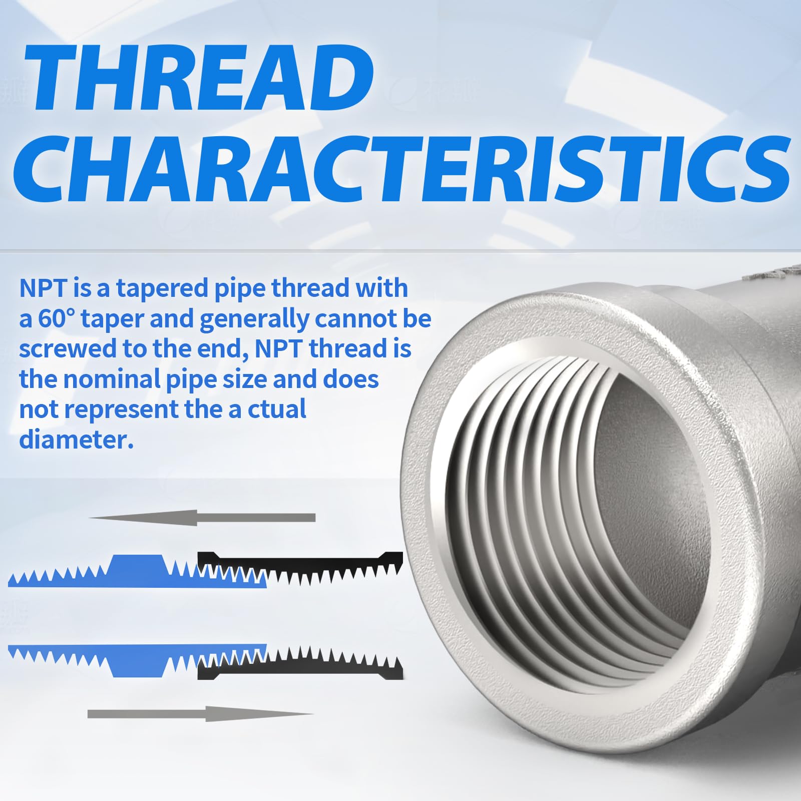 NOTICE - NPT is a tapered pipe thread with a 60° taper and generally cannot be screwed to the end, these 304 stainless steel fittings are lead-free.