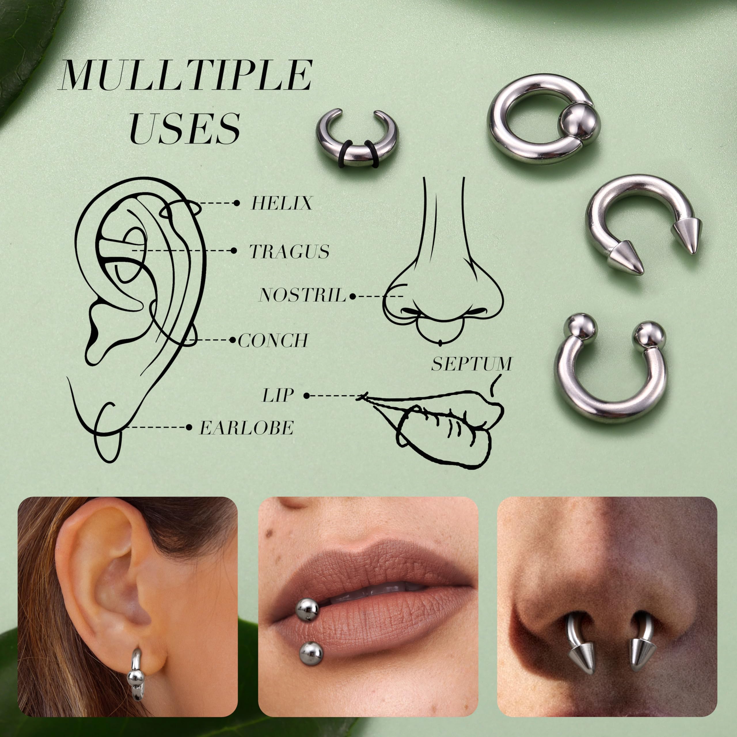 【Multi-Purpose Piercing】--Our pincher septum serve multiple functions, seamlessly transitioning between septum rings, earrings, and gauge stretching kit. Whether for your nose, ear, septum, labret, lip, tragus, eyebrow, or any other desired area, they offer versatility and style.