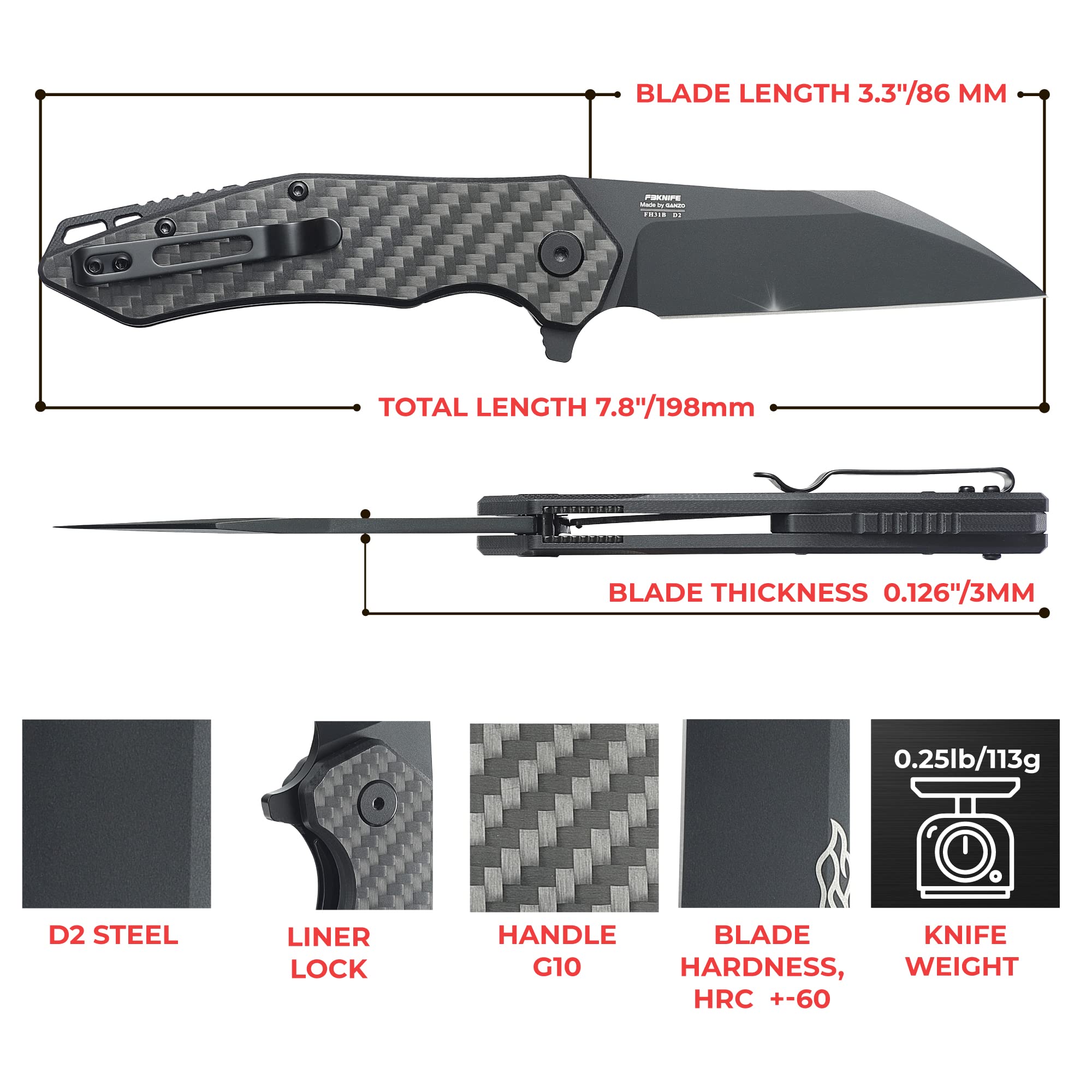 Folding knife with D2 stainless alloy blade - the corrosion resistance of which is increased by the addition of chromium and nickel. Its hardness is 60 HRC and the steel holds an edge well