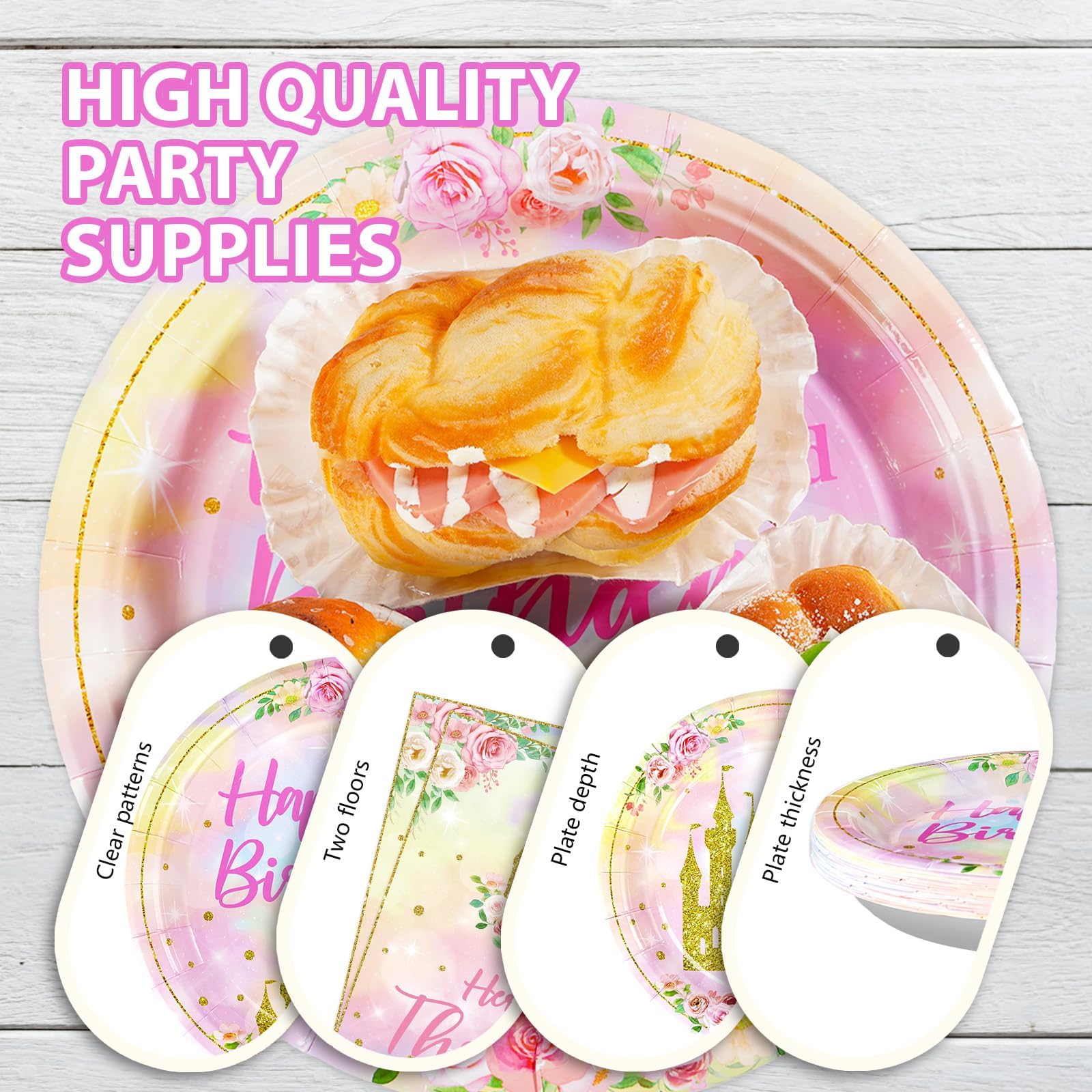 Princess Castle Theme Design: Our princess theme birthday party decorations tableware has been carefully designed with a gradient watercolor pastel rainbow base, with beautifully printed crowns, castles and flowers, as well as detailed elements of the princess enchantment will make your birthday party a dreamy fairytale world