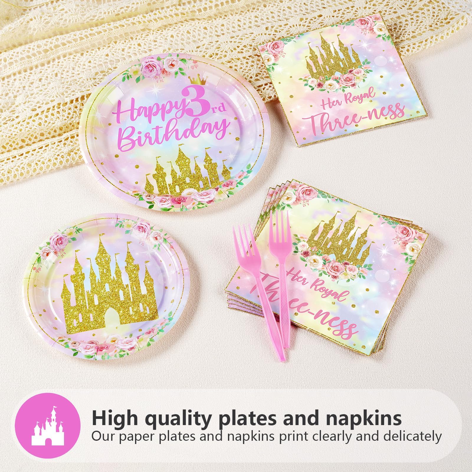 What You Get: The 96 pcs princess party decorations tableware set is a must-have for your 3rd girl's special day, including 24 9" princess plates, 24 7" princess plates, 24 princess napkins and 24 forks for up to 24 guests, adding a sweet touch to a princess birthday party
