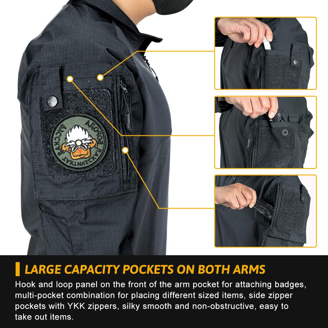 2. Equipped with two pockets on each arm and a small loop hole, these shirts provide ample storage for essentials like phones, maps, and compasses. Customize with personal or team patches on the hook-and-loop panels, and detachable elbow pads offer added protection.